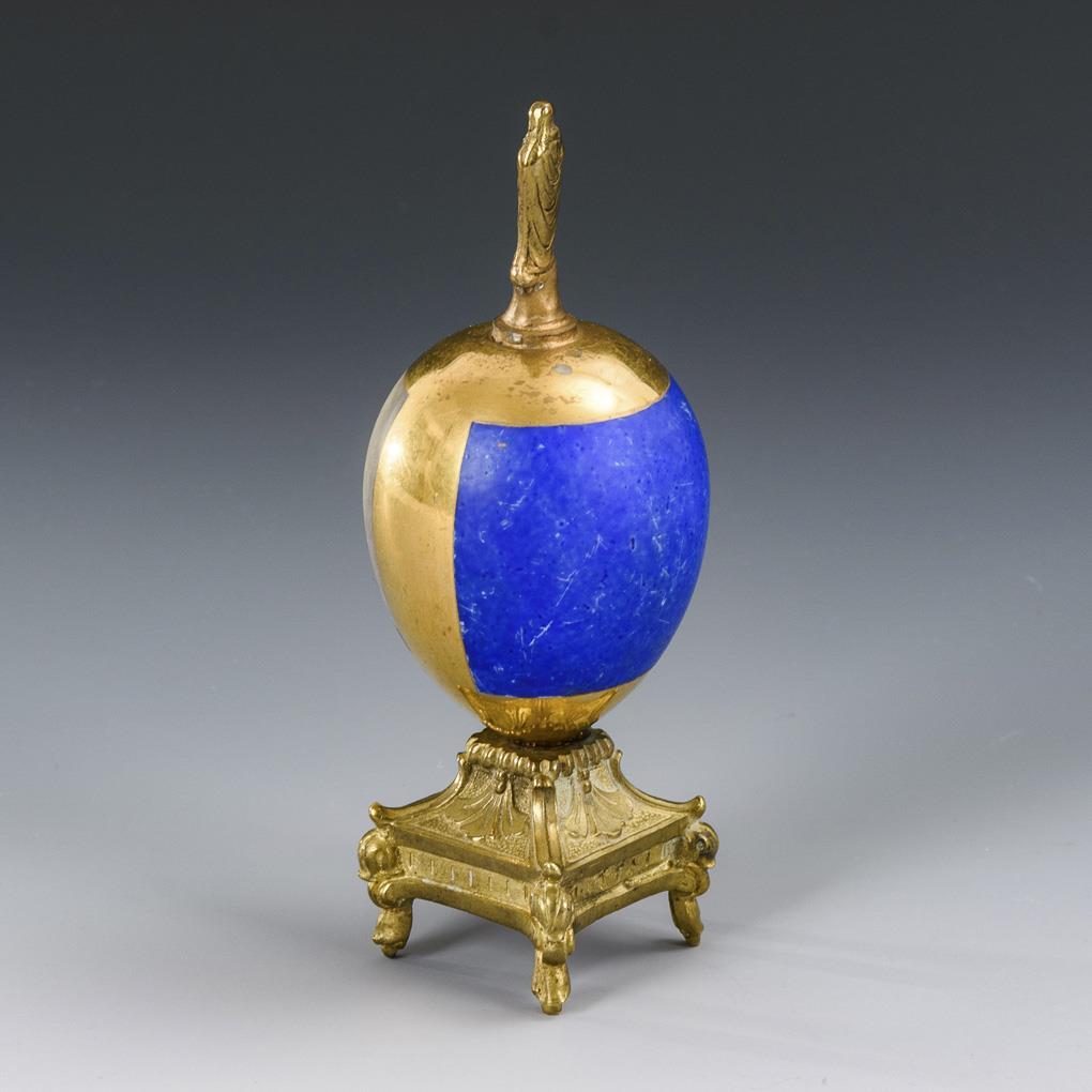 Auf einen quadratischen Sockel montiertes Porzellanei mit Madonnenbekrönung aus Metall. Schauseitig die Darstellung der Auferstehung Christi, verso powderblauer Fond. Kratzspuren auf dem Fond.