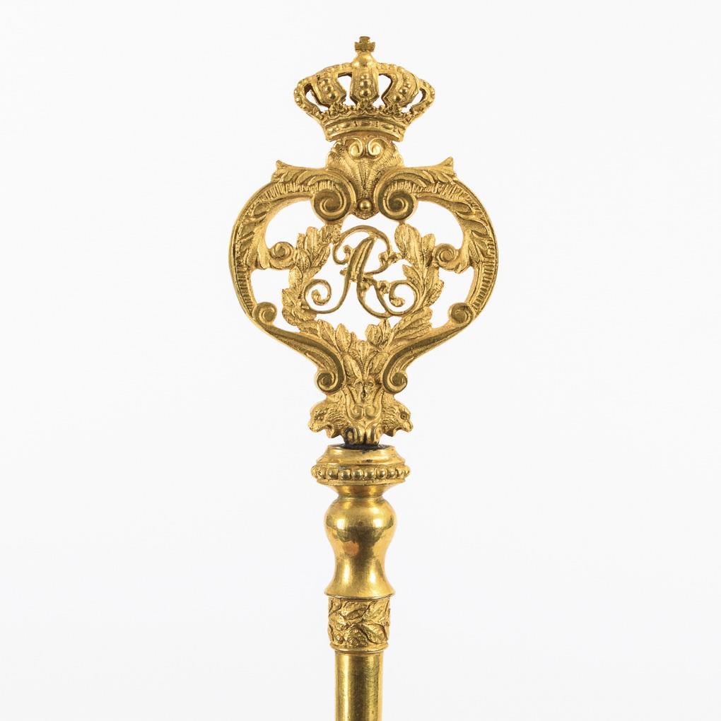 Aufwendig gearbeitete Reide mit Monogramm "AR" im Lorbeerkranz zwischen Voluten sowie Königskrone. Profilierte Reide mit Lorbeerfries, konischer Halm mit Köpfchen, schlichter Bart. Halterung jünger ergänzt.
