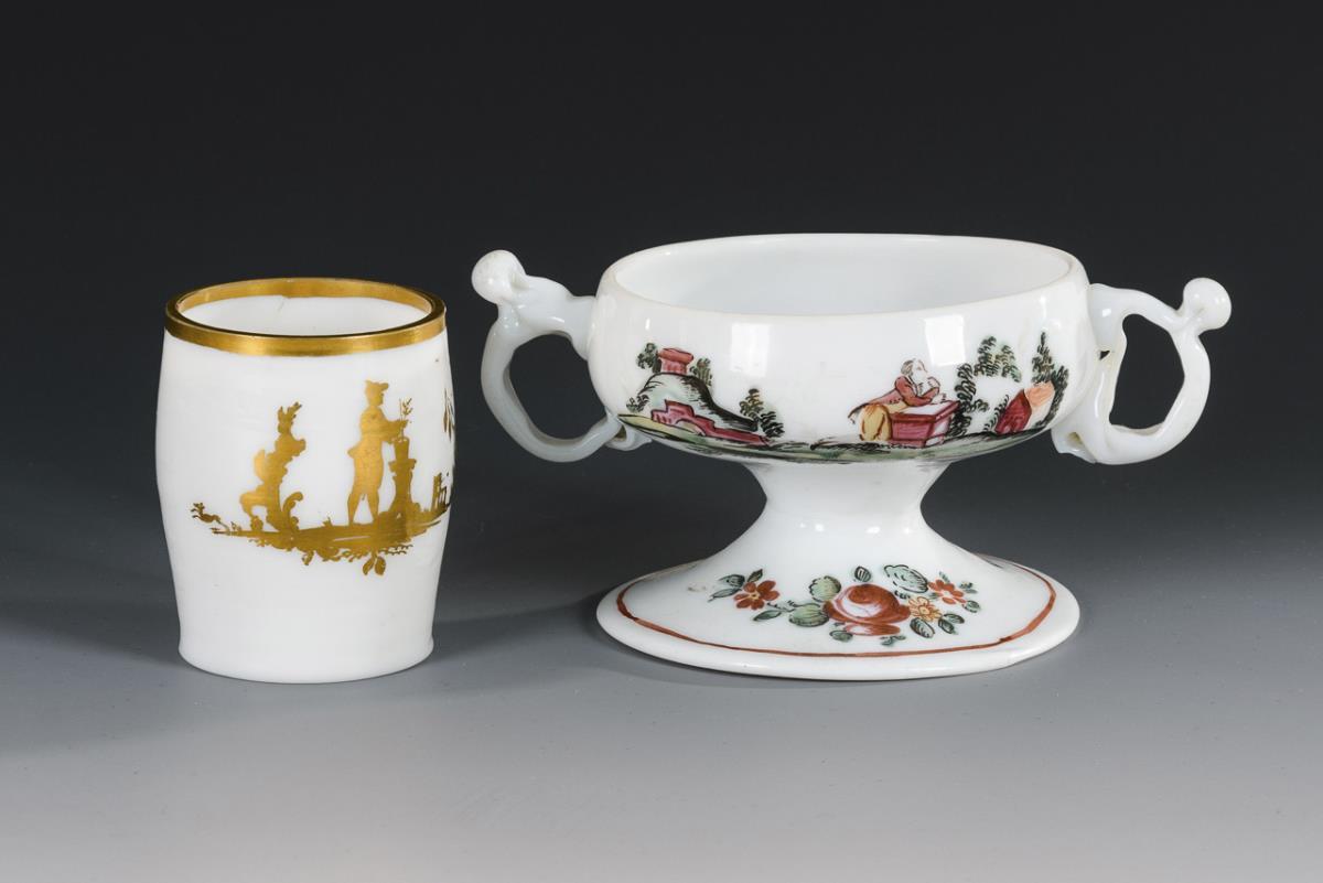 1x Fußschale mit zwei angeschmolzenen Henkeln. Schauseitig die Darstellung einer Landschaft mit Architektur und kniendem Herren, verso Blumenmalerei. / 1x Becher mit goldener Chinoiseriemalerei. Schale innen etwas berieben, Becher mit Spannungsriss.