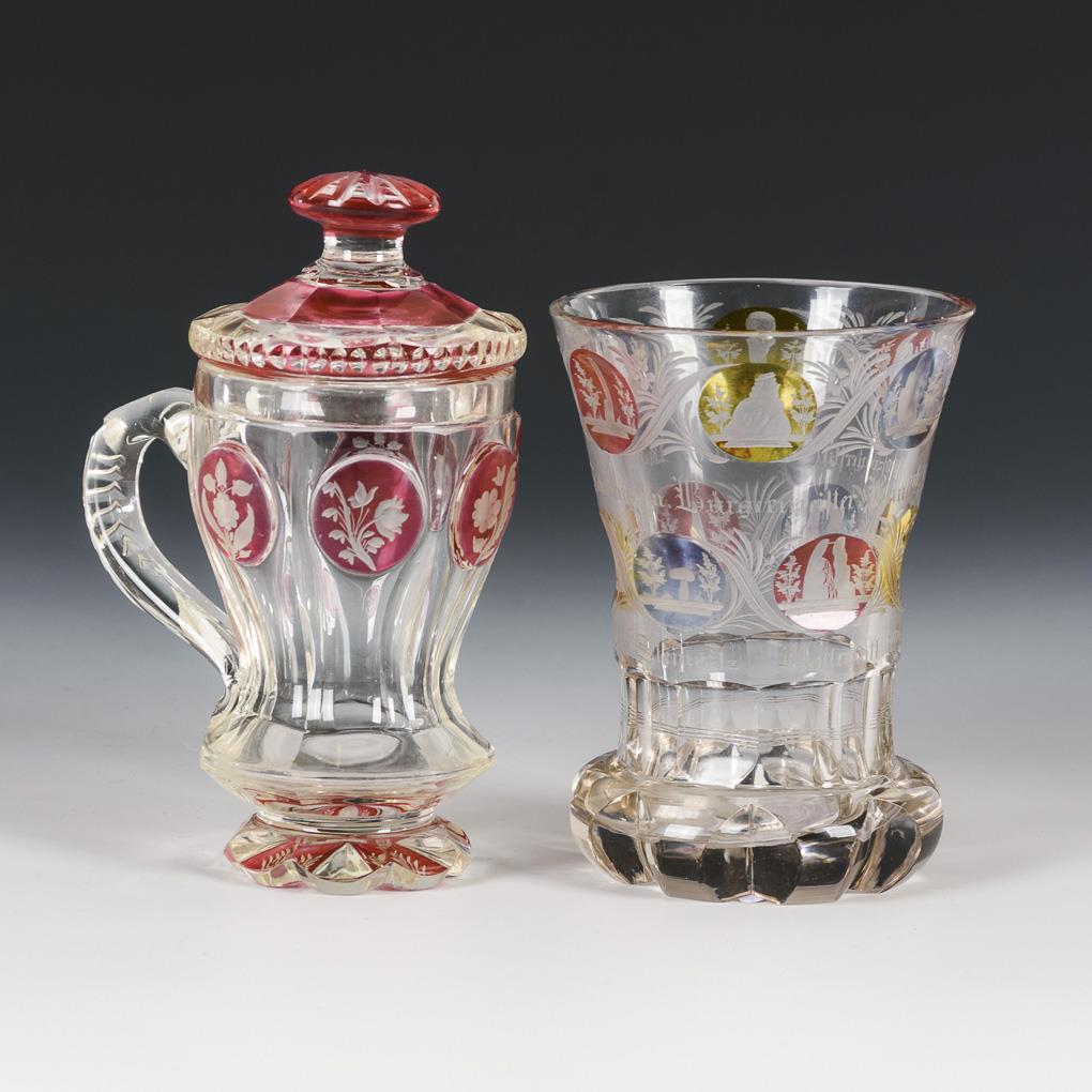 Becher mit Linsen- und Facettenschliff sowie gravierten und bezeichneten kleinen Ansichten der Felsenstadt Adersbach in Tschechien, ausgekugelter Abriss. / Henkelbecher mit Facettenschliff und hochgeschliffenen Medaillons, darin gravierte kleine Blumenbuketts. Mündungsrand des Bechers minimal bestoßen, 1 minimale Bestoßung an einer Schliffkante des Henkelbechers.