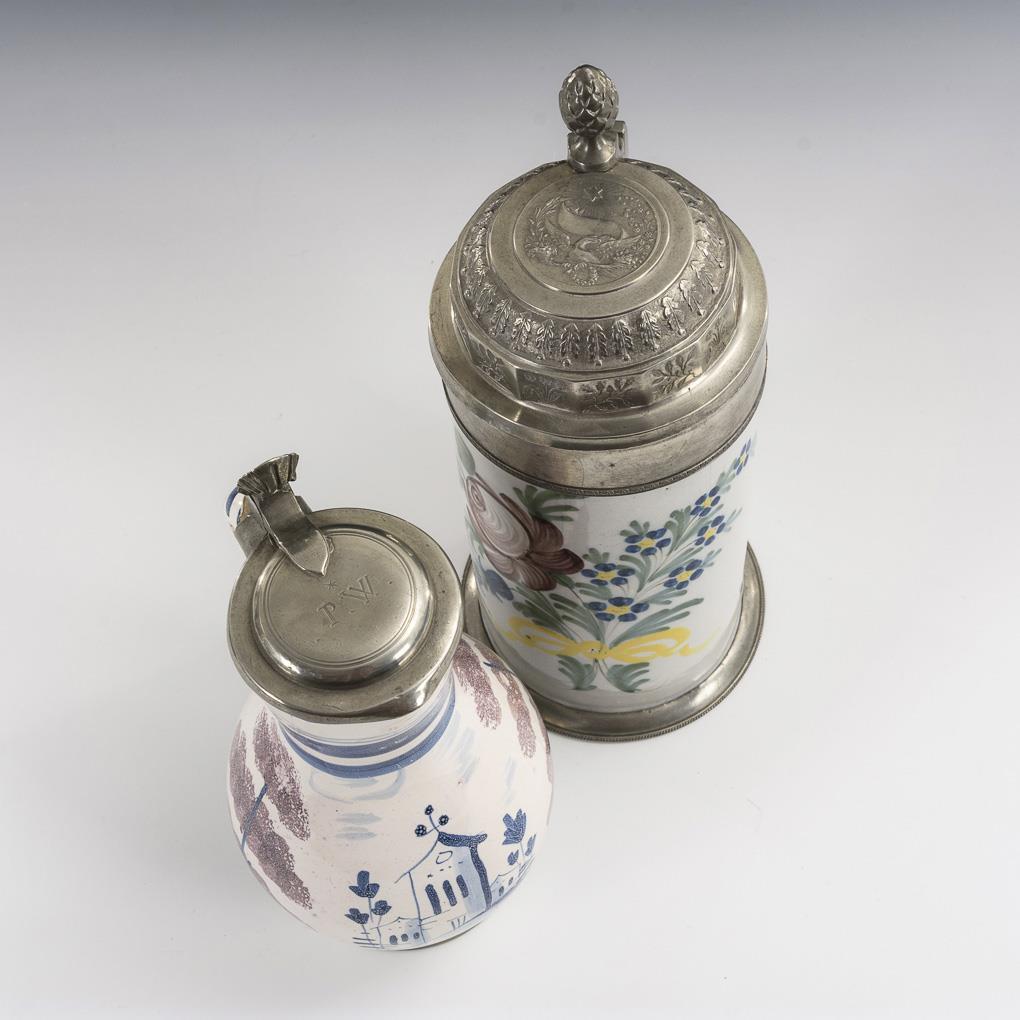Walzenkrug mit Blumenstrauß, am Boden geritzte "9", ergänzter Relief-Zinndeckel, Zinnstand (H 25 cm). Kleiner Birnkrug mit Architektur, ungemarkt, Zinndeckel mit Muscheldrücker, graviert "PW" (H 21,5 cm). Walzenkrug mit 2 Haarrissen und gelockerter Zinnmontierung, partiell leichte Glasurdefekte.