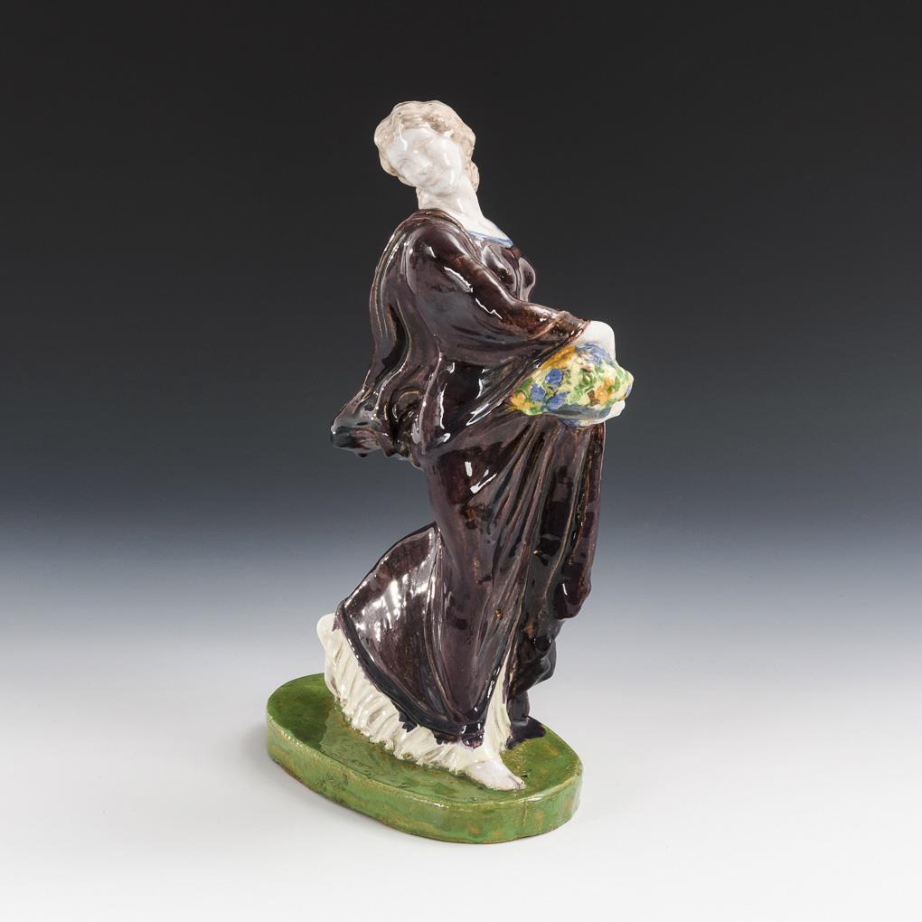 Schreitende Dame in violett-blauem Gewand, mit Blumenkorb, auf Ovalsockel. An Haaren und Blumen minimale Glasurchips.