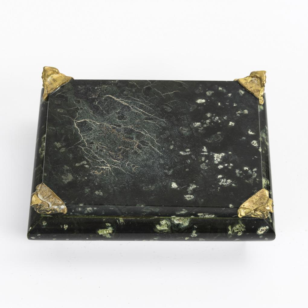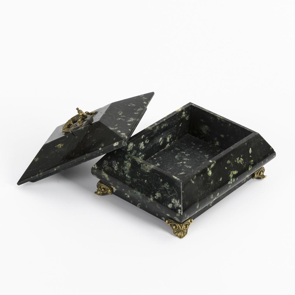 Kissenförmige Steinschnitt-Dose mit Bronzefüßen und -Knauf.