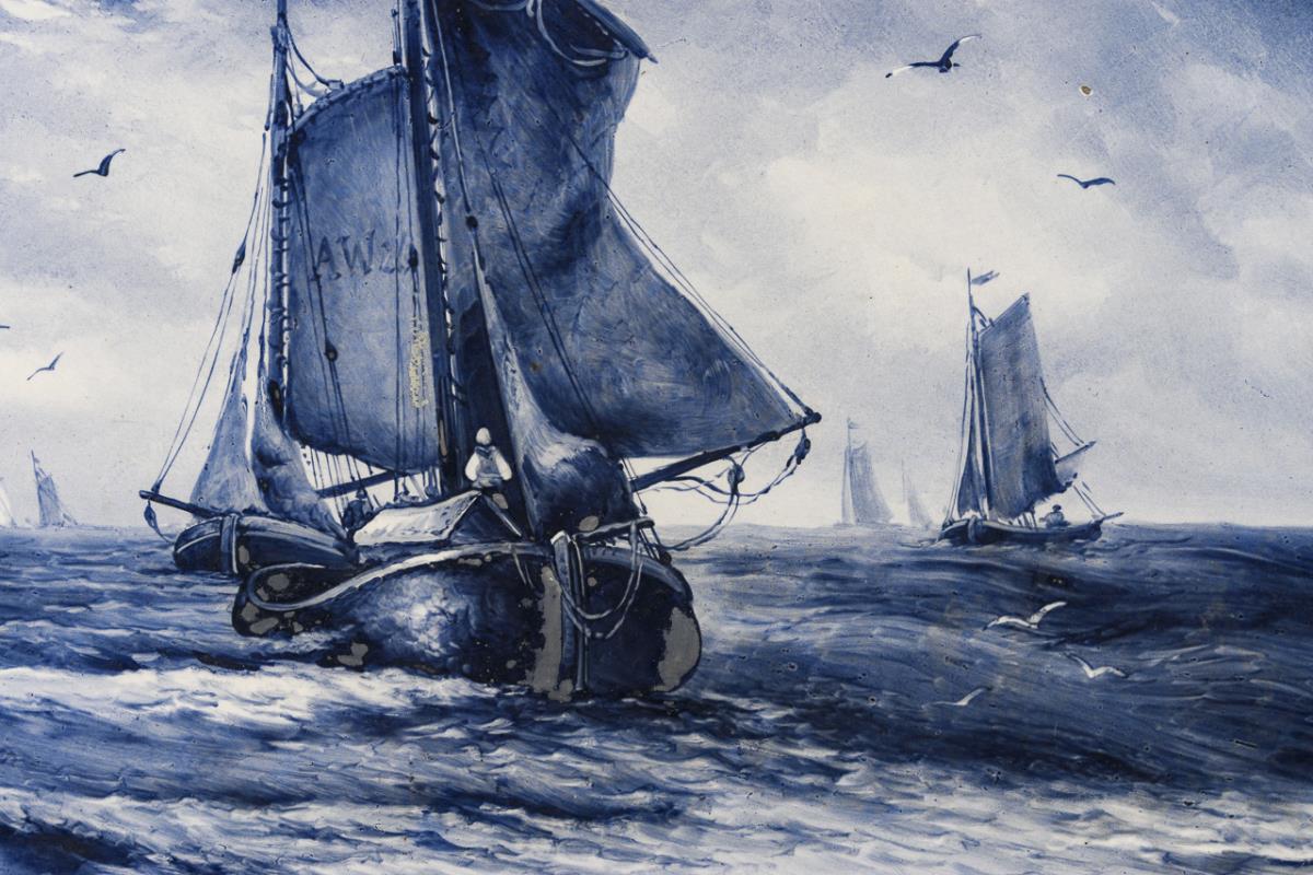 Ansicht mehrerer Segelboote auf dem Meer und Ansicht eines Flussarms mit Windmühlen und Fischern.