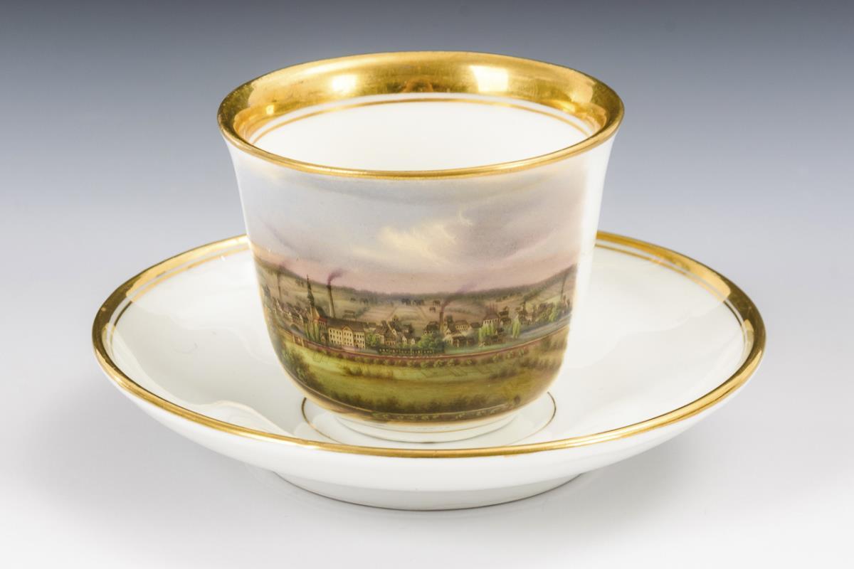 Polychrom bemalt, goldstaffiert. H Tasse 7 cm, Ø Untertasse 15 cm.