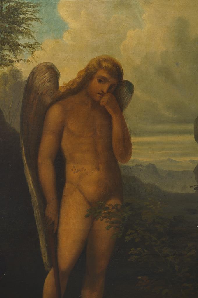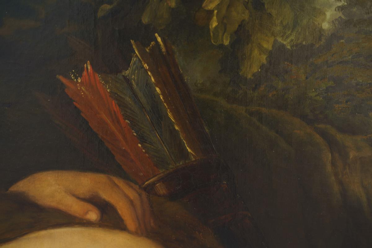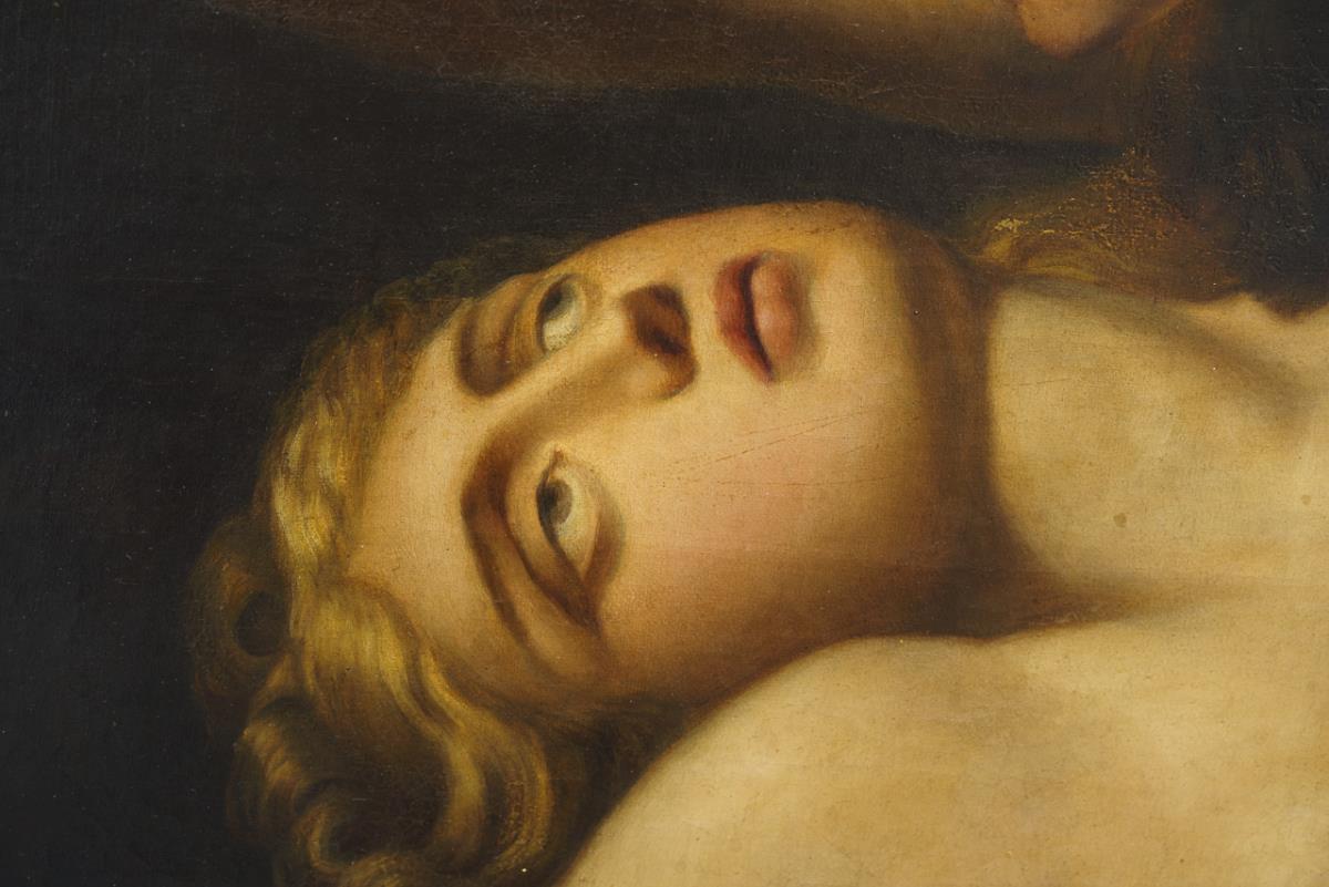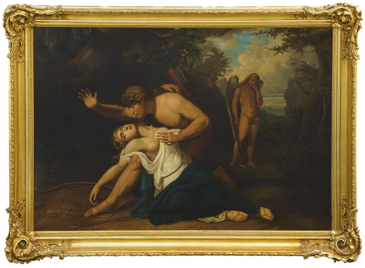 Sehr gute Kopie nach dem Original, das heute in Venedig zu sehen ist, mit dem erschrockenen Kephalos, der erkennen muss, dass er seine Frau Prokris, welche sich im Gebüsch verbarg, erschossen hatte, weil er sie für ein Wildtier hielt. Im Hintergrund eine geflügelte Gestalt mit gesenkter Fackel, dem Zeichen des Todes. Eine sehr kleine restaurierte Stelle mit Hinterklebung.