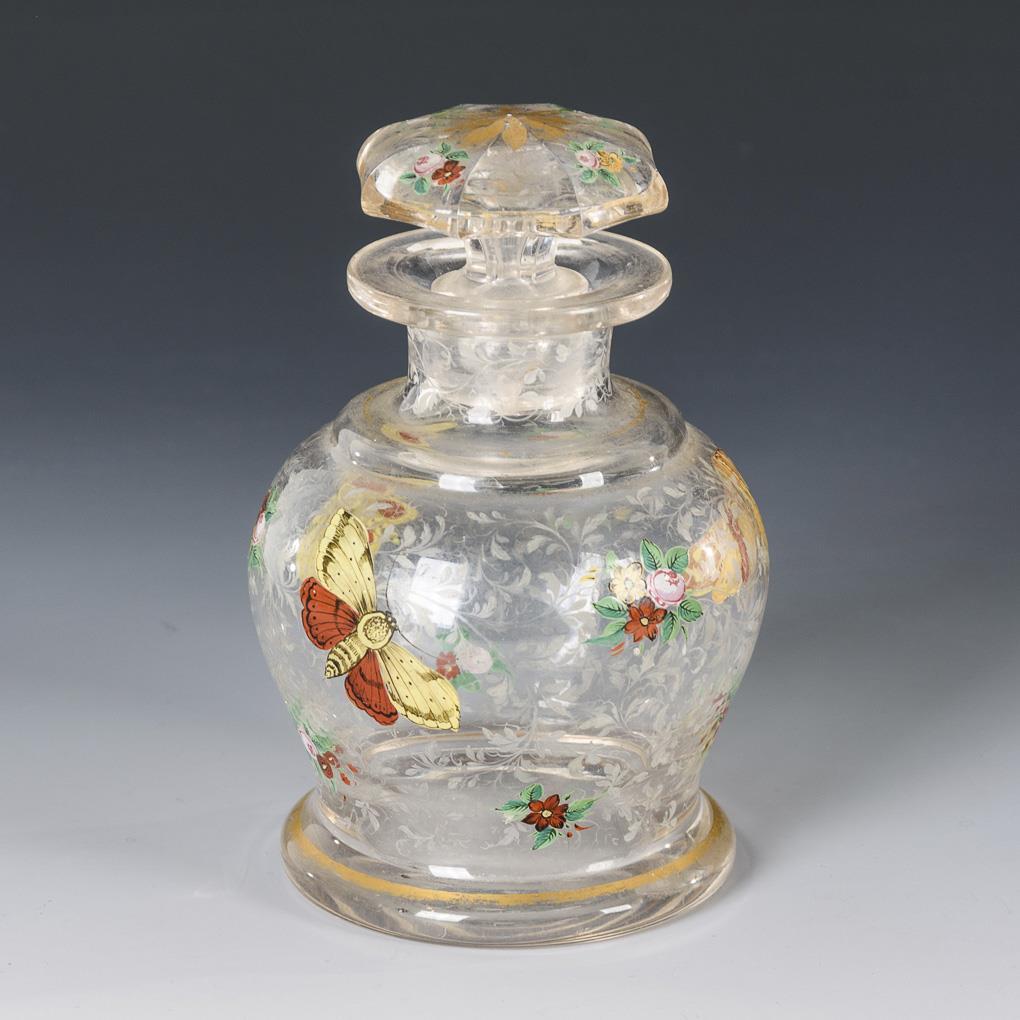 Gedrückte Balusterform, facettierter Stopfen, ausgekugelter Abriss. Auf der Wandung gemalte Schmetterlinge und kleine Blumenbuketts sowie weiße Blattranken. Etwas berieben, kleine Bestoßung am Mündungsrand.