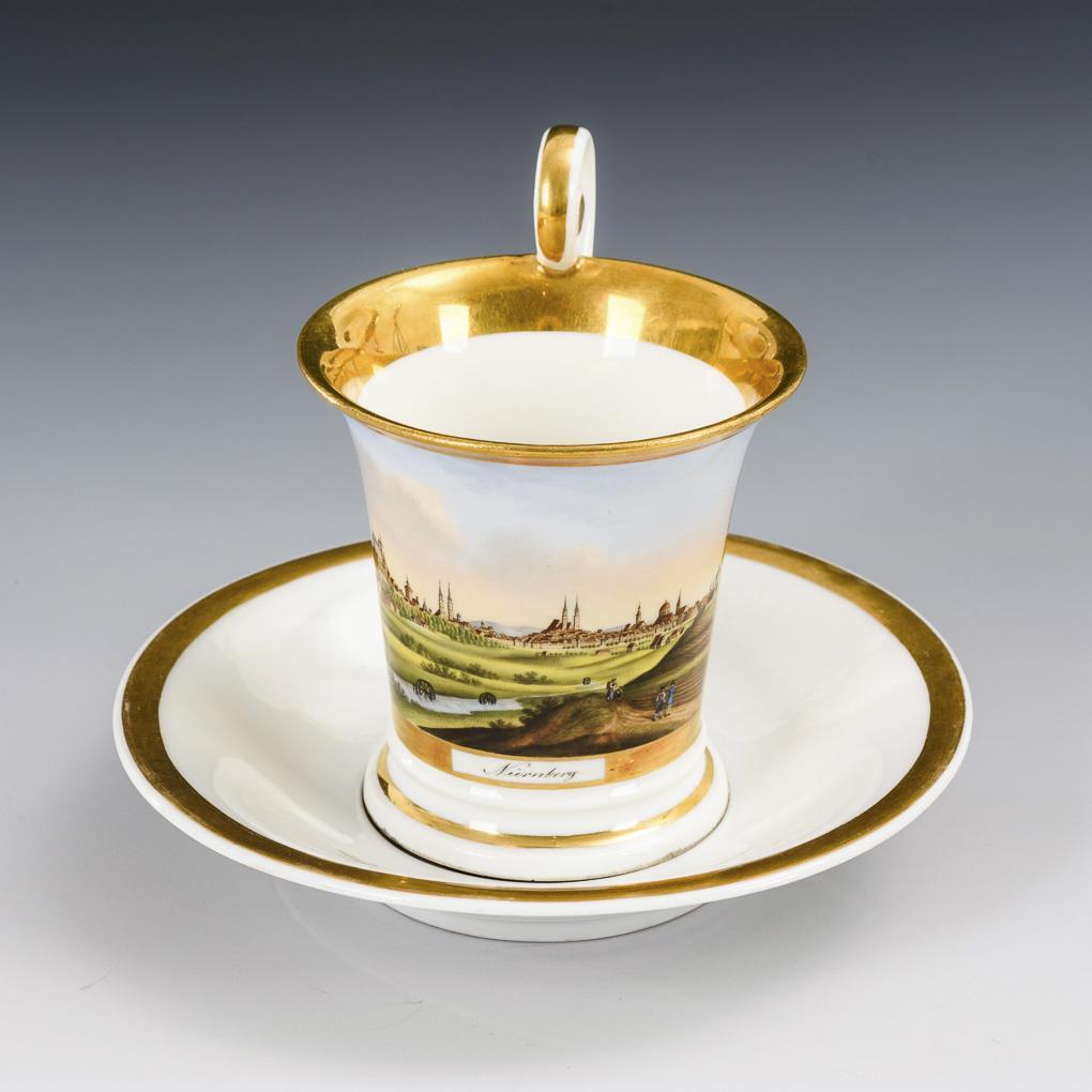 Kratertasse mit Rosettenhenkel. Schauseitig eine goldgerahmte Rechteckkartusche mit der bezeichneten Vedute der Stadt Nürnberg.
