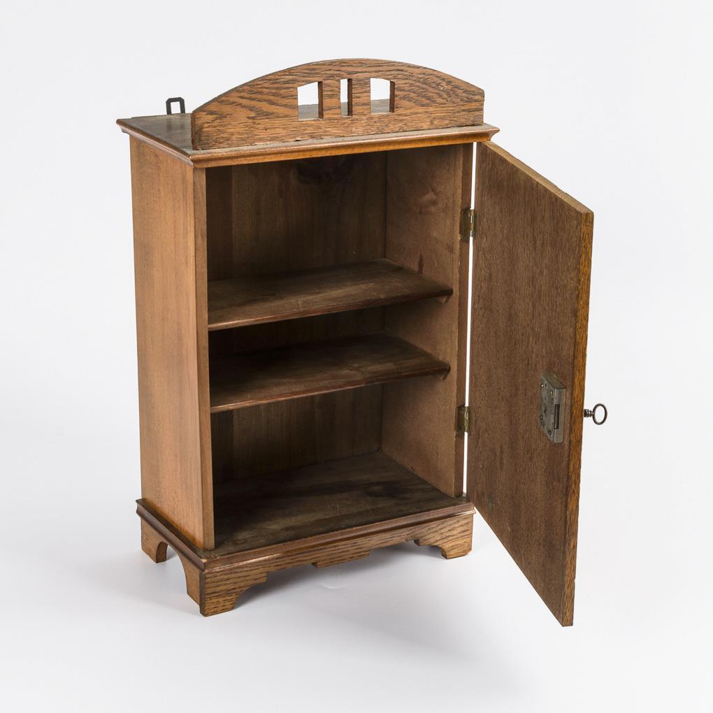 1-türiges Schränkchen mit Zierscharnieren. Innenaufteilung mit zwei Brettchen. Kann gestellt oder an der Wand befestigt werden.
