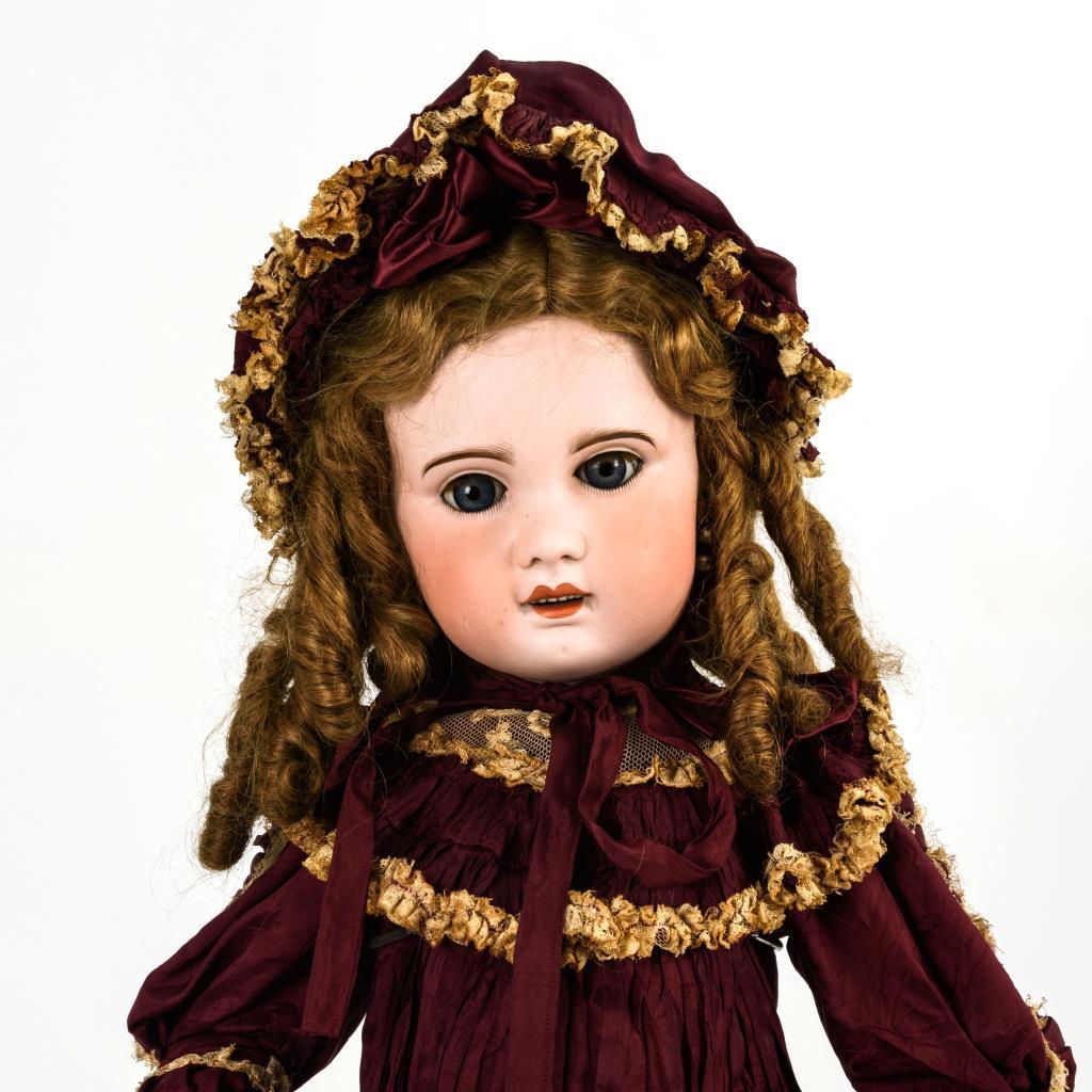 Kurbelkopf, blaue Schlafaugen, Wimpern, offener Mund, Zähnchen, Ohrringe, braune Mohairperücke mit Korkdeckel. 11-teiliger Gliederkörper partiell übermalt. Weinrotes Kleid, passender Hut. Kopfkrone unsauber gearbeitet, mit kleinen Chips. Brandriss unter dem linken Ohr.