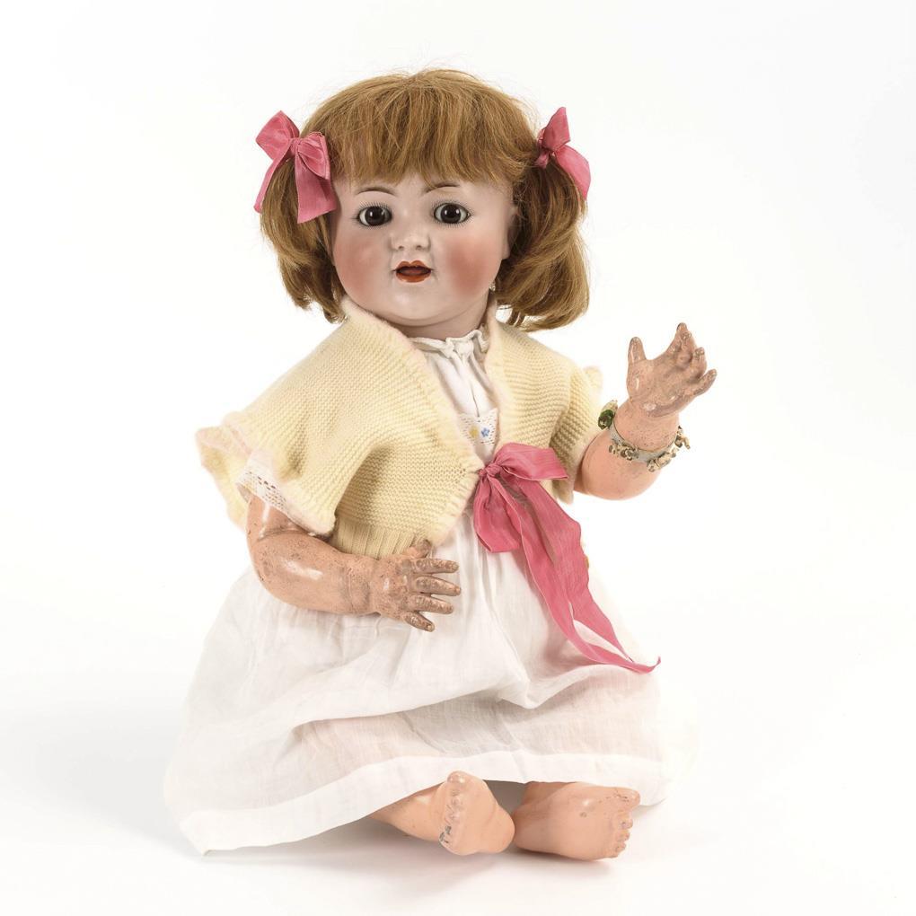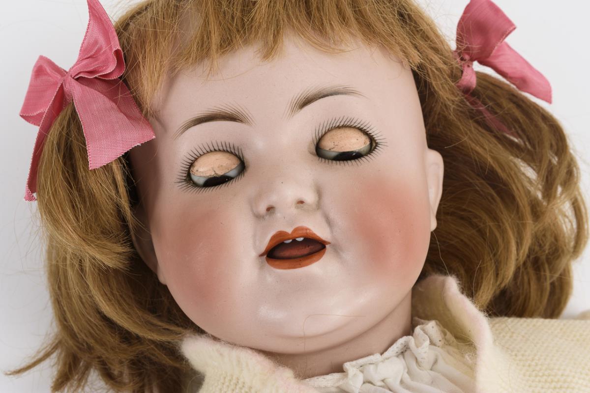 Kurbelkopf, braune Schlafaugen, bewegliche Zunge, rotblonde Echthaarperücke. 5-teiliger Sitzbabykörper. Weißes Hemdchen, gestrickte ärmellose Weste. Kopf durchleuchtet: ohne Defekte. Hände berieben, am rechten Fuß minimal bestoßen.