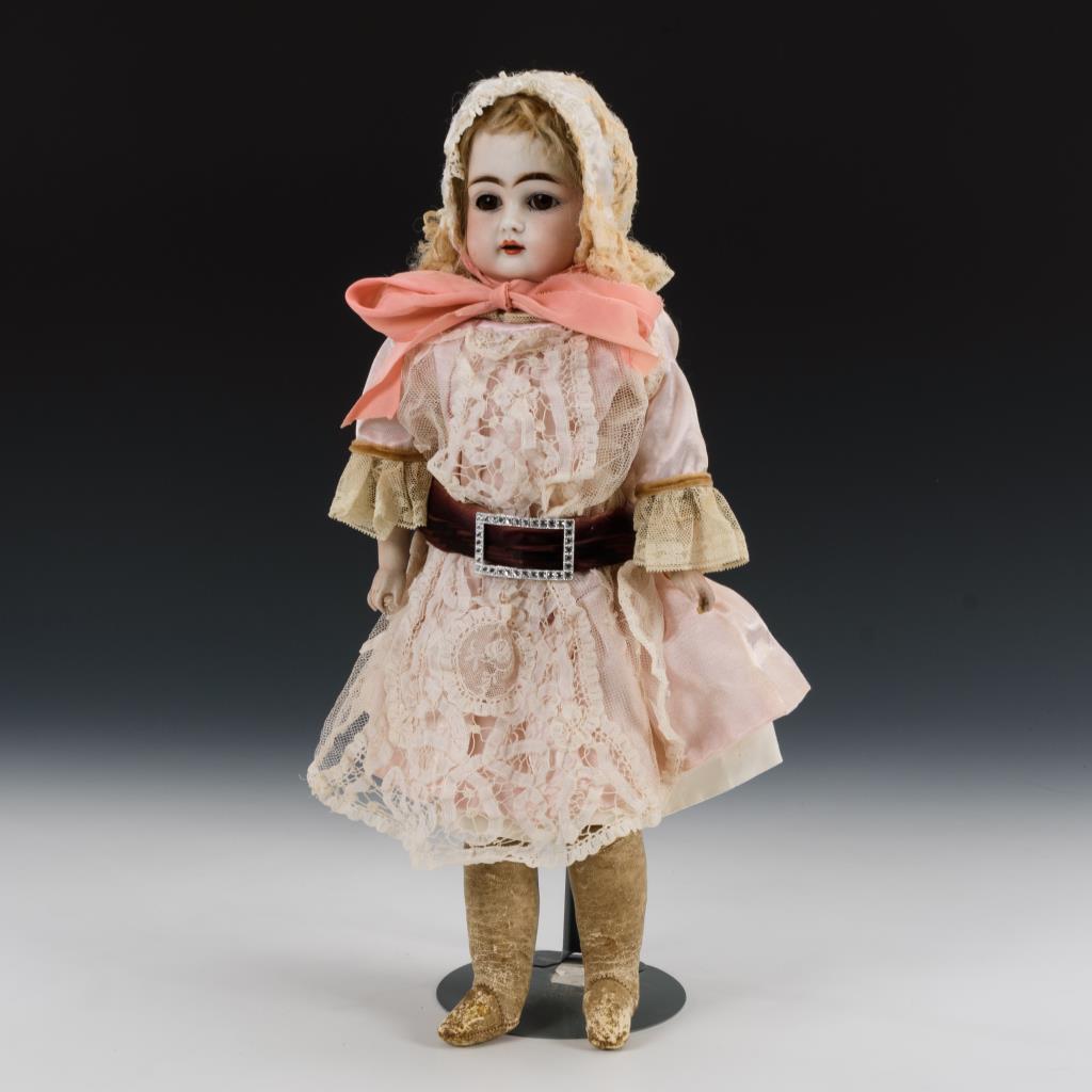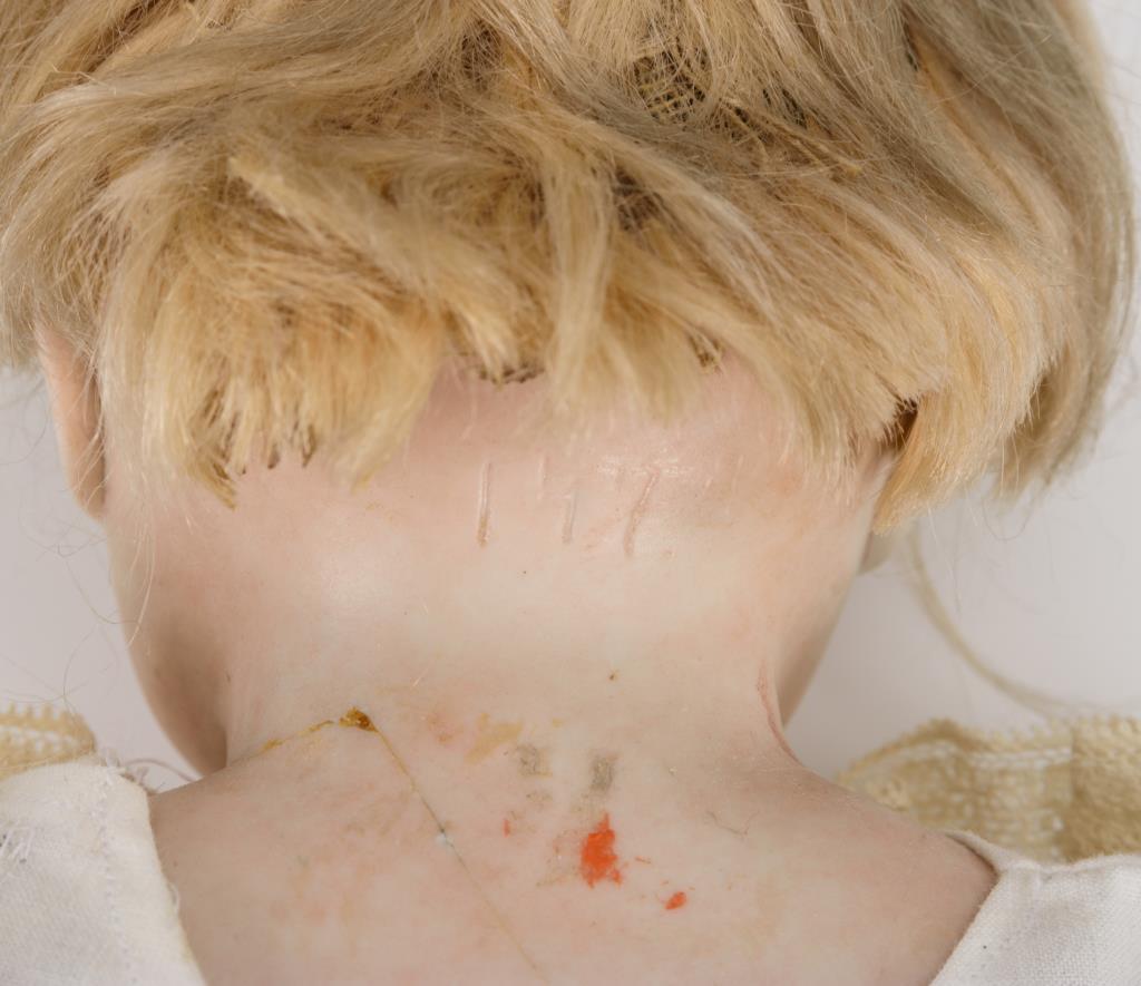 Brustkopf, braune Schlafaugen, offener Mund, defekte blonde Mohairperücke. Schlanker Lederkörper mit Po- und Kniezwickeln, Unterarme aus Biskuit. Rosa Kleid mit Spitze, weiße Haube. Kopf hinten haarrissig.