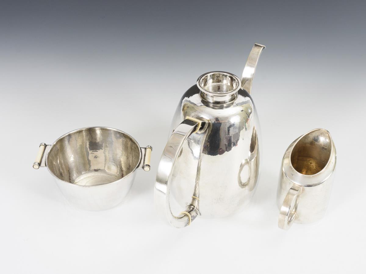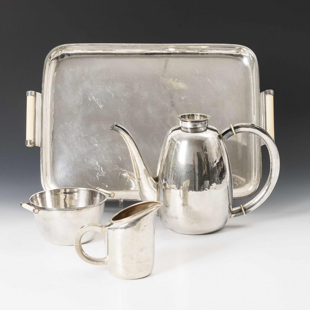 Handgetriebenes Art-déco-Set mit stabförmigen Elfenbeingriffen: Kaffeekanne, Zuckerschale und Milchkännchen auf Tablett (925 gestempelt). Zuckerschale am Stand gedellt, Tablett mit Kratzern.