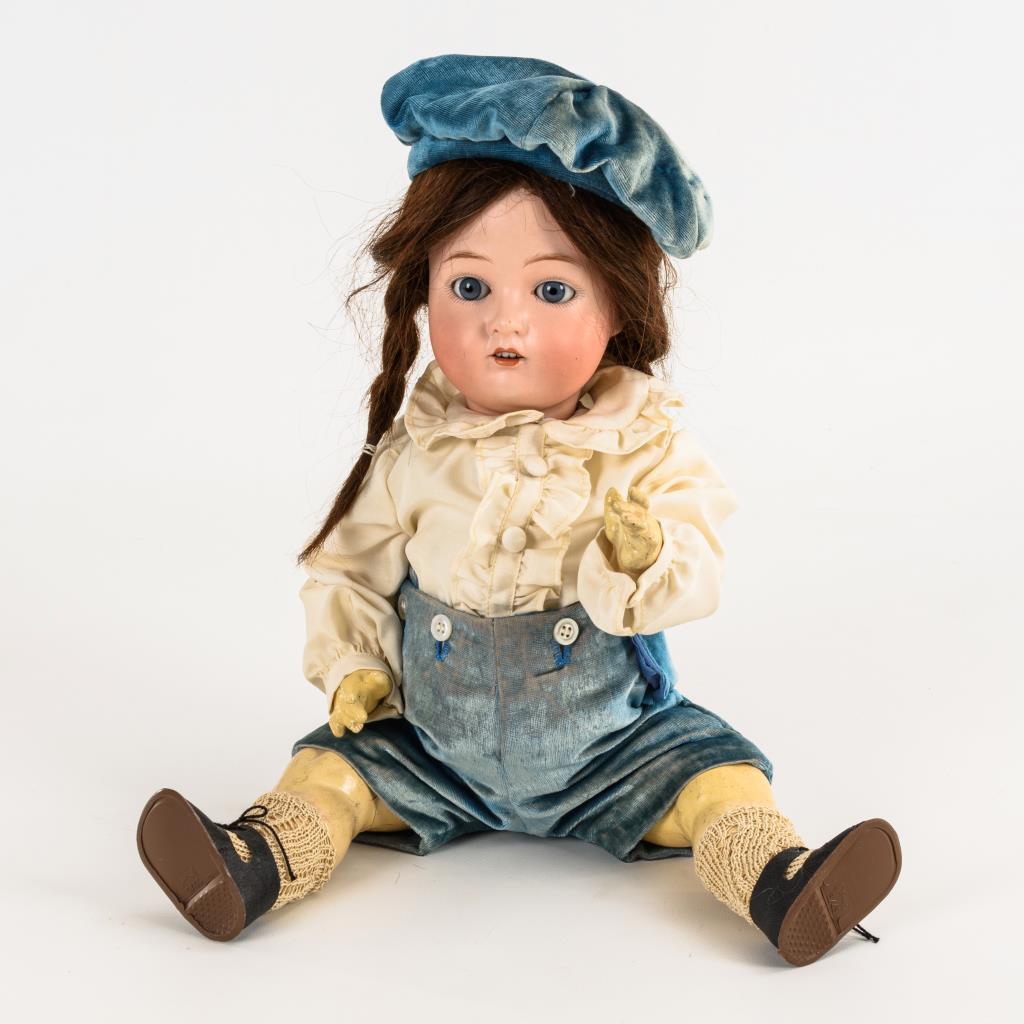 Kurbelkopf, verklemmte blaue Schlafaugen, modellierte Augenbrauen, offener Mund, rotbraune Echthaarperücke. 5-teiliger Stehpuppenkörper. Blaue Samthose, passende Mütze. Kopf durchleuchtet: ohne Defekte. Körper rissig, teils übermalt.