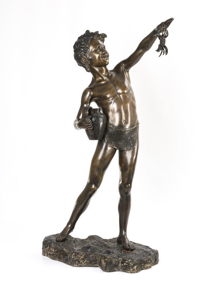 Stehender Knabe im Lendenschurz, der die Krabbe hochhält. Teils sichtbare Gussnähte, einige Schrammen.