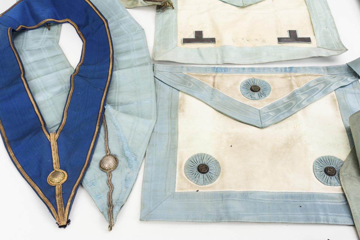 4 light blue gauntlets, 4 official ribbons in light blue with silver and dark blue with gold, 4 aprons partly with rosettes, tassels and dews. 1 pair of white cloth gloves, 1 beffchen, 2 light blue bijou ribbons with snake hooks, 1 snake hook, 1 lodge applique without no., white ribbons. Signs of age/use.