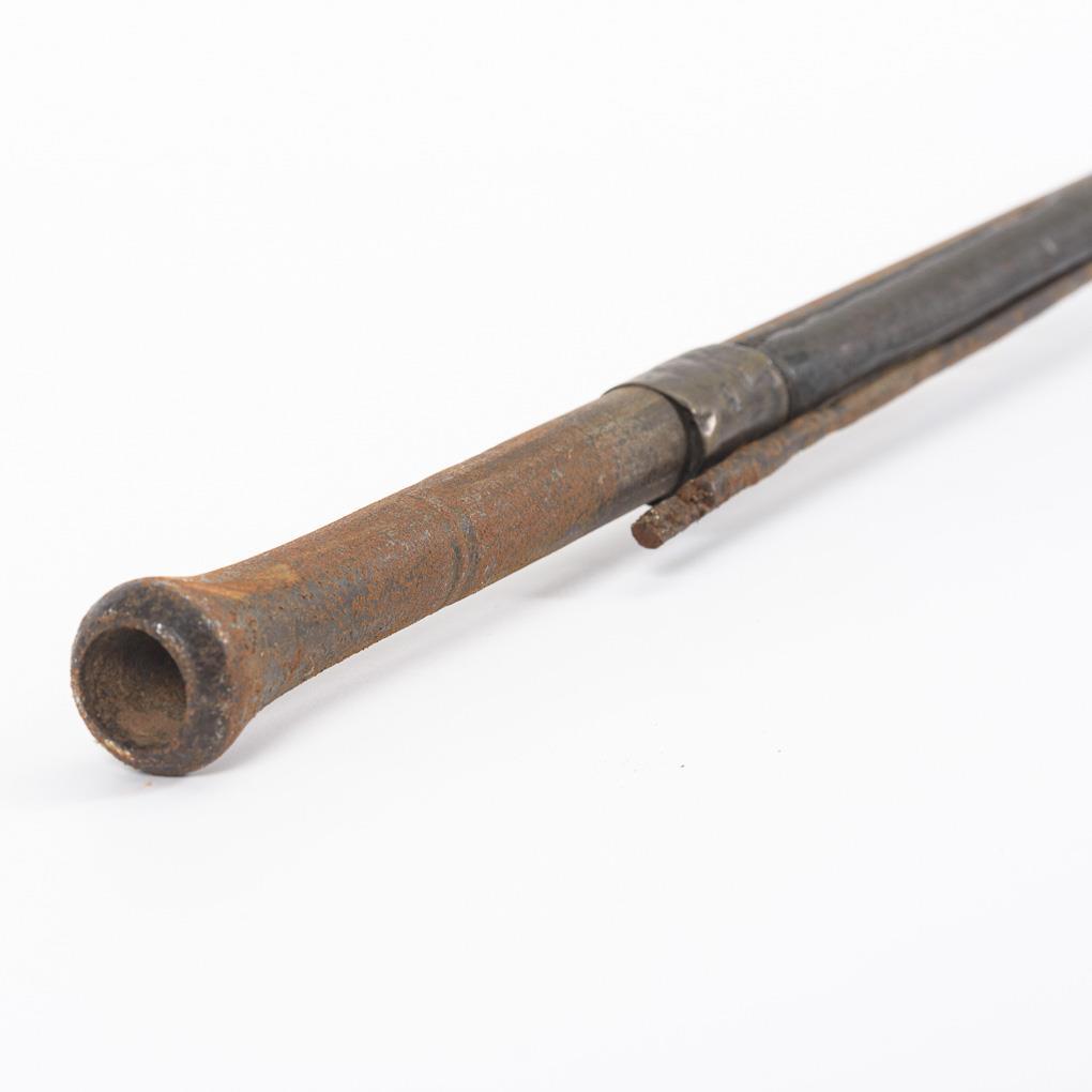 Musket with long barrel, butt of triple wood. Lock with external mechanism. Counterplate supplemented and nailed. Strong signs of age and use.