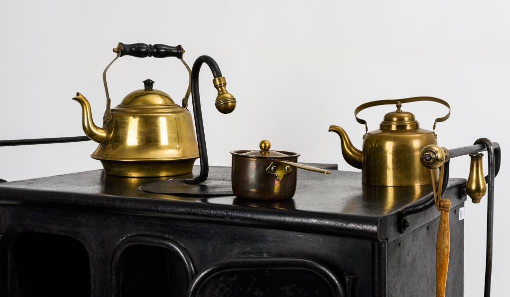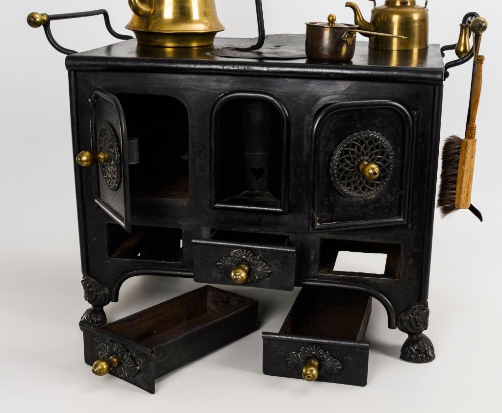 Außergewöhnlicher Herd mit verzierter Front, 2 Türen und 3 Schüben. Von oben zu befeuern, mit Abdeckung. Dazu 2 Messingkessel, kleiner Topf, Schürhaken und Handfeger.