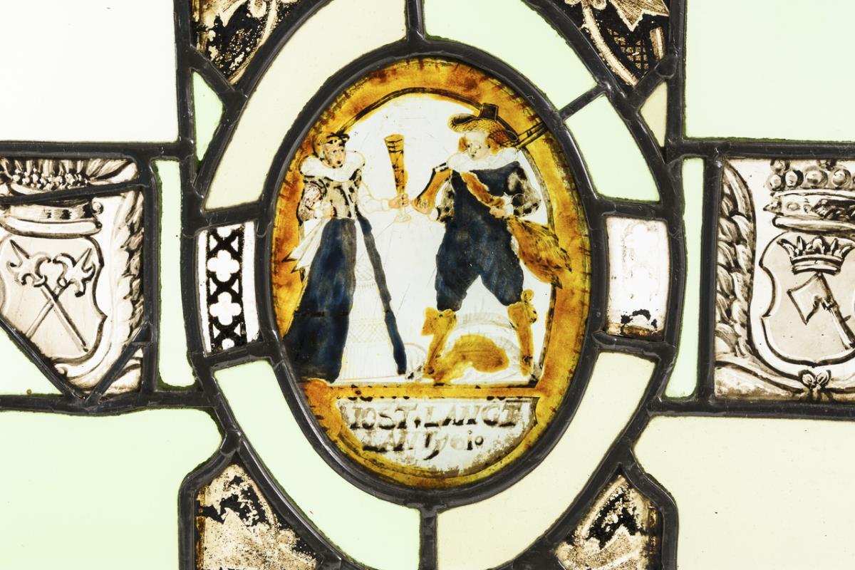 Clear glass and coloured glass, partly stained and painted, partly inscribed. Lead rods, brass molding. Window beer pane 18.5 x 13.5 cm, total 47 x 40 cm.