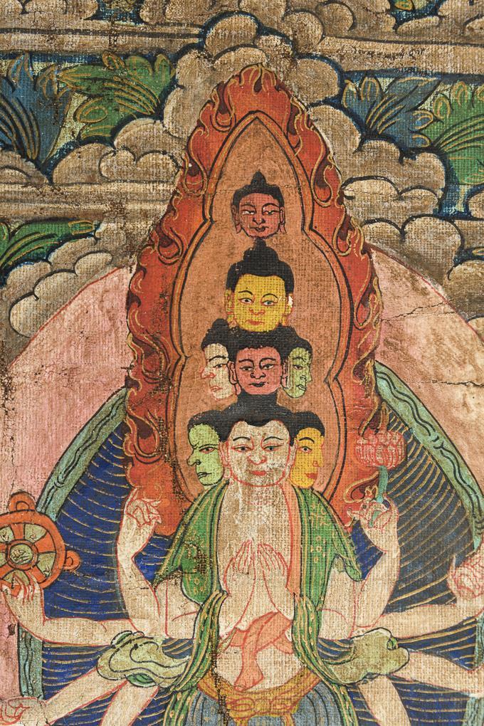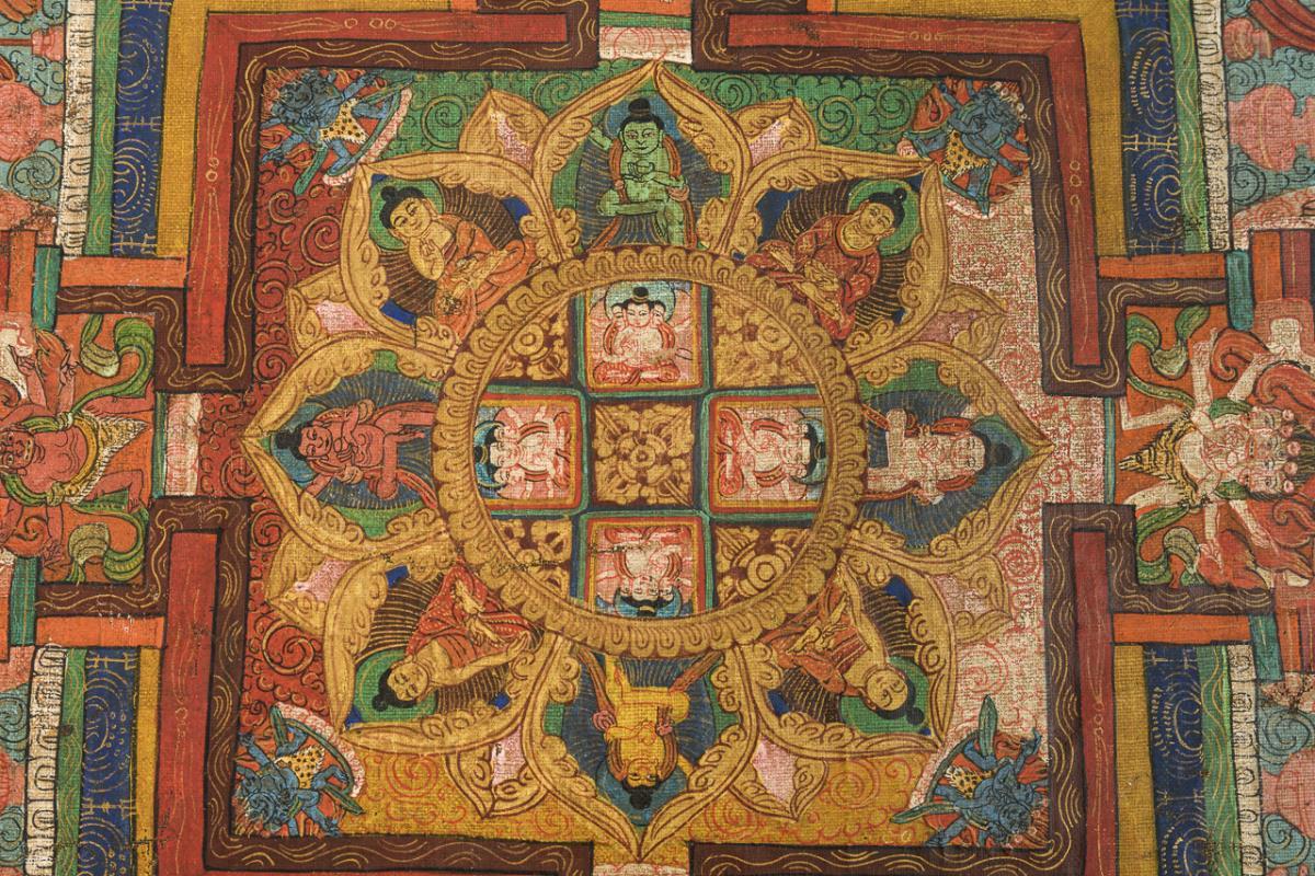 Depicting several mandalas with the cardinal points, the central part surrounded by depictions of celestial burial. Flanked by taras and a monk. Very finely painted execution. Traces of age, margin faintly frayed.