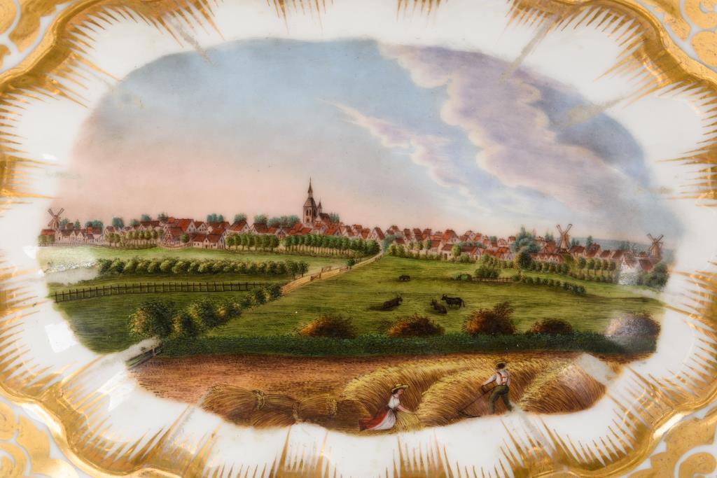 Ovale Schale mit durchbrochenen Handhaben. Im Spiegel die verso bezeichnete Ansicht der Stadt Meldorf in Schleswig-Holstein.