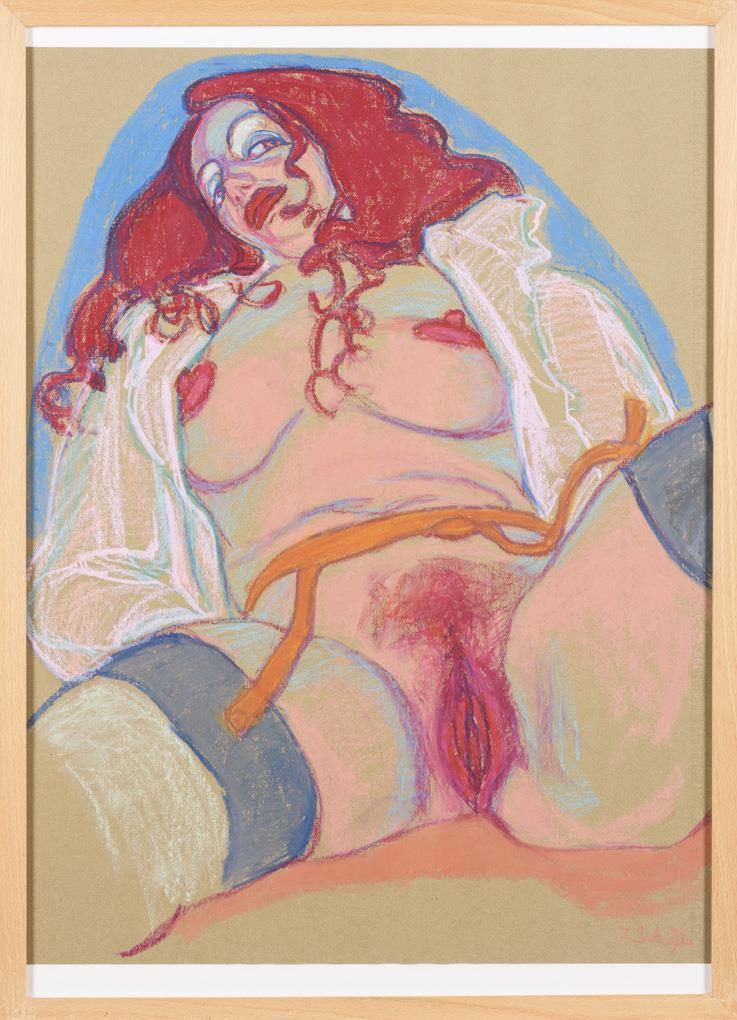 In grellen Farben gemalter und mit gespreizten Beinen liegender Frauenakt.
