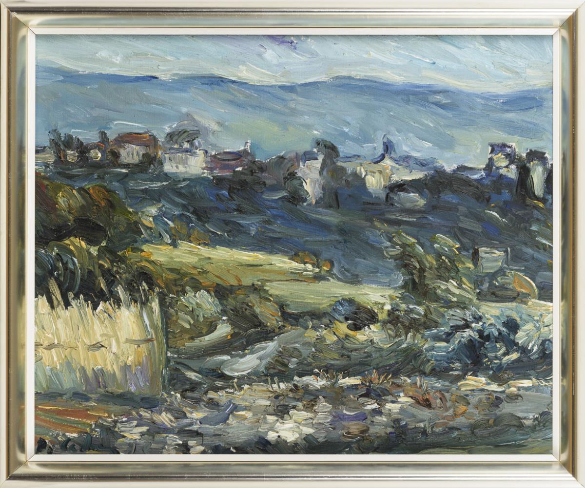 Expressiv gemalte Landschaft mit einer Ortschaft auf dem Berg unter wolkigem Himmel.