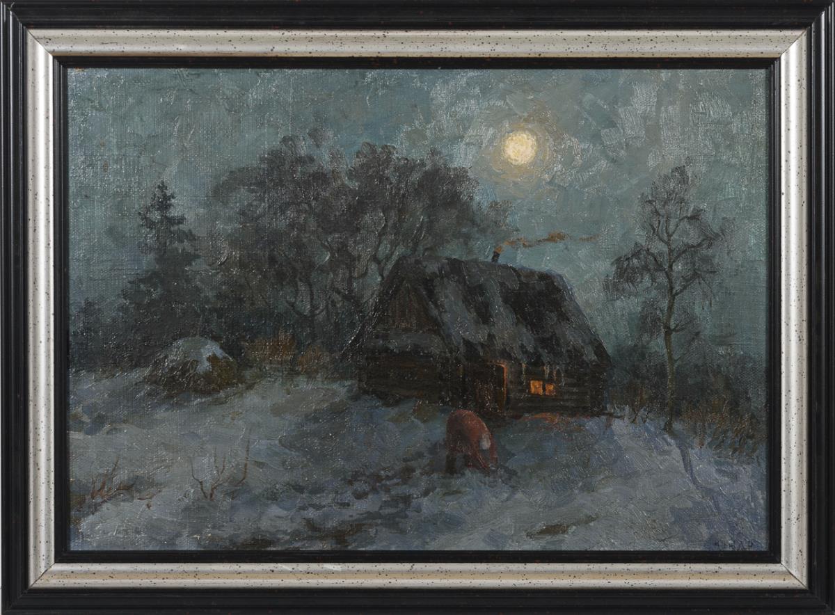 Bauer in der Nacht vor dem Haus im Schnee im Mondschein.