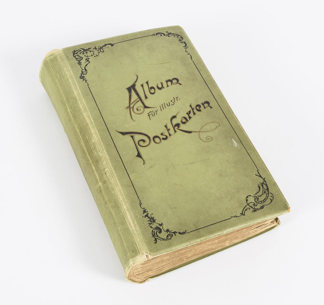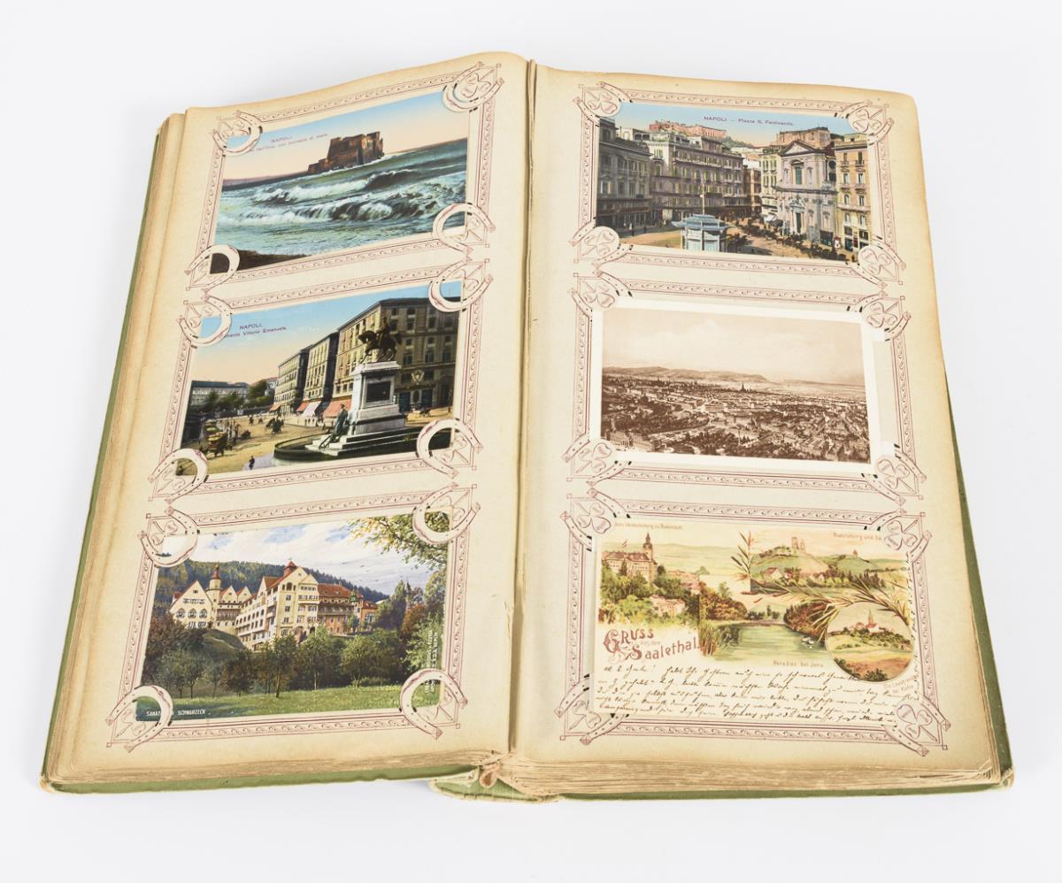 Wohl originales Album mit Karten zwischen 1900 und ca. 1930. Frankreich, Italien, Rom, Brüssel, Wien, Holland, aber auch Jena und vieles andere mehr. Grüner Einband "Album für illustr. Postkarten".