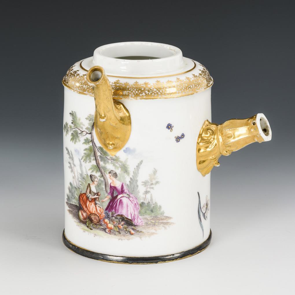Zylinderkanne mit Röhrenausguss und seitlichem Stielansatz. Schauseitig die Darstellung zweier Rokokodamen vor einem Fruchtarrangement, verso eine Rokokodame mit einem Knaben in einer Parklandschaft. Ohne Deckel und Stiel, minimaler Goldabrieb.