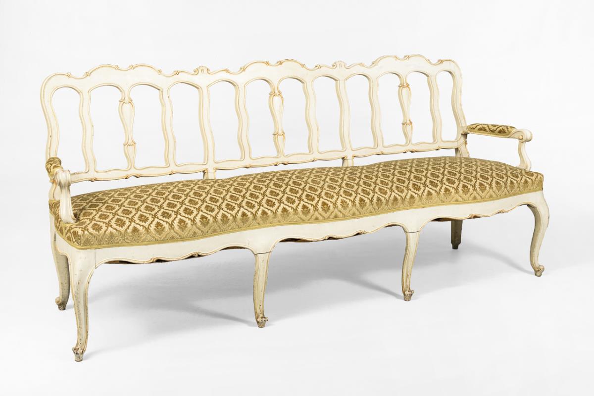 Viersitzige Bank mit durchbrochen-geschweifter Rückenlehne und volutenförmigen, gepolsterten Armlehnen, auf 8 geschwungenen Beinen; champagnerfarbener Samtbezug mit Palmettenrapport. Restauriert, Alters-/Gebrauchsspuren, Polster und Bezug ergänzt.