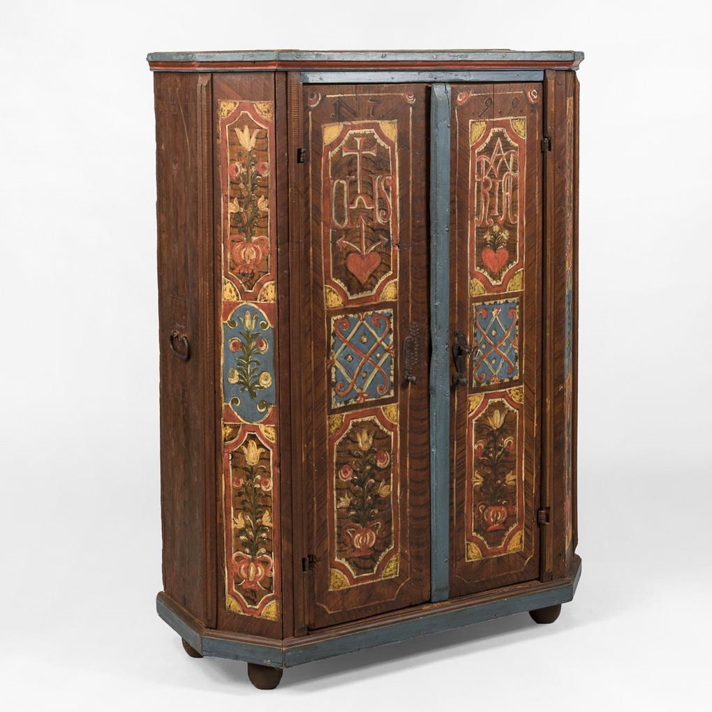 2-türiger Schrank in Brettbauweise mit Floraldekor und Hochzeitssymbolik; innen 1 Einlegeboden. Alters-/Gebrauchsspuren, inaktiver Anobienbefall, Bemalung etwas berieben.