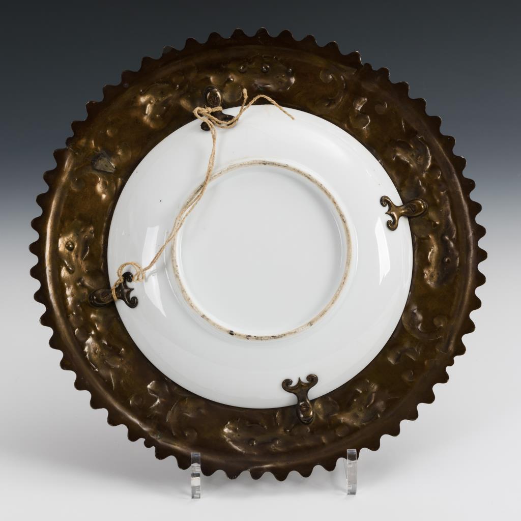 Polychrome Malerei über Linienvordruck.Ø Teller 20 cm, im reliefierten Metallrahmen Ø 31 cm.