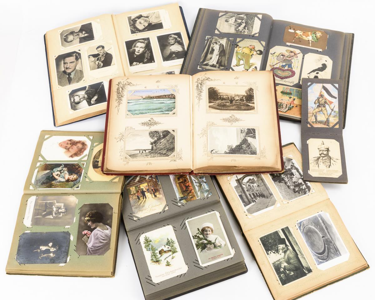 Album mit ca. 273 Schauspieler-Porträtkarten der 30er Jahre, überwiegend Ross-Verlag. Blaues "Album" mit Mohnblüten. 39 x 25 cm / Album mit ca. 86 Karten nur Nordafrika, vor 1945, grüner Einband "Postkarten-Album", 26 x 21 cm. / "Kriegs-Erinnerungen" mit ca. 10 Karten I. Weltkrieg, im kleinen, grauen Album, 12 x 18 cm. / Ca. 129 Motivkarten, vor 1945, im grünen "Album" mit Tänzerin. 28 x 23 cm. / Ca. 200 Ansichtskarten mit zahlreichen topografischen Ansichten, aber auch Militär, Farblithografien u.a., vor 1945, im roten "Postkarten-Album", 33 x 25 cm. / Ca. 259 Motivkarten in 2 verschiedenen dunklen Alben, um 1920, 39 x 27 cm und 26 x 19 cm.