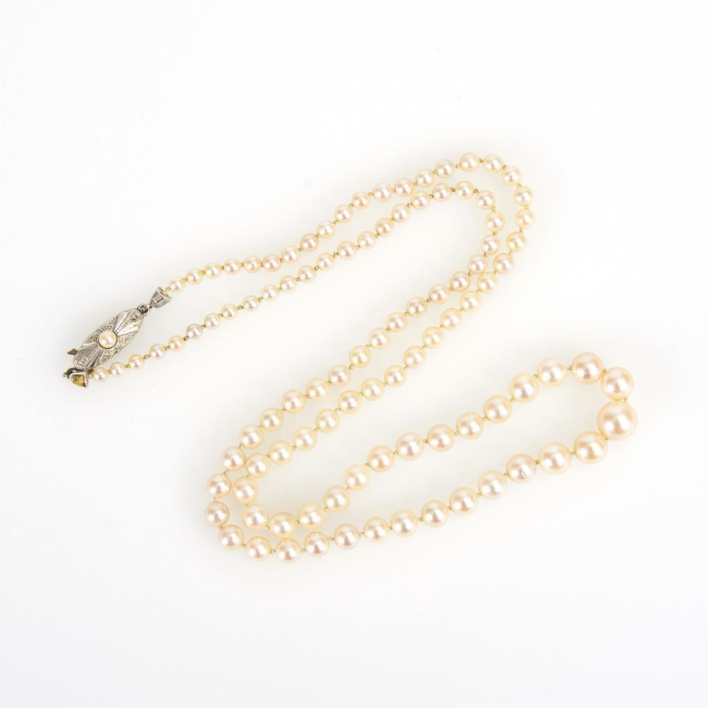 Lacing necklace with cultured pearls in gradient, individually knotted. Small decorative clasp.