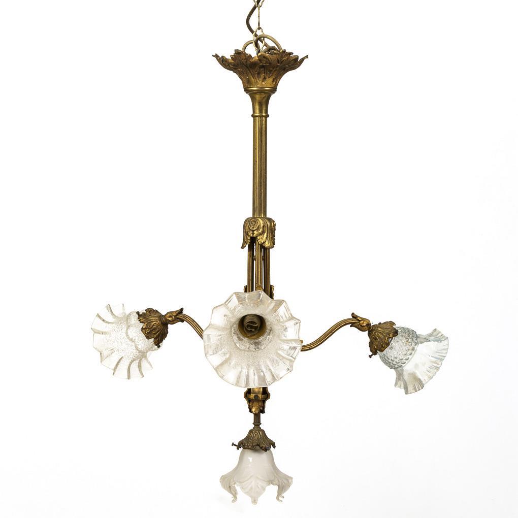 4-flammige Hängelampe an kanneliertem Bronzeschaft mit Palmettenbaldachin, 3 geschwungenen Armen und 1 Mittelschirm mit blütenförmigen Lampenschirmen. Alters-/Gebrauchsspuren, Glasschirme verschieden ergänzt.