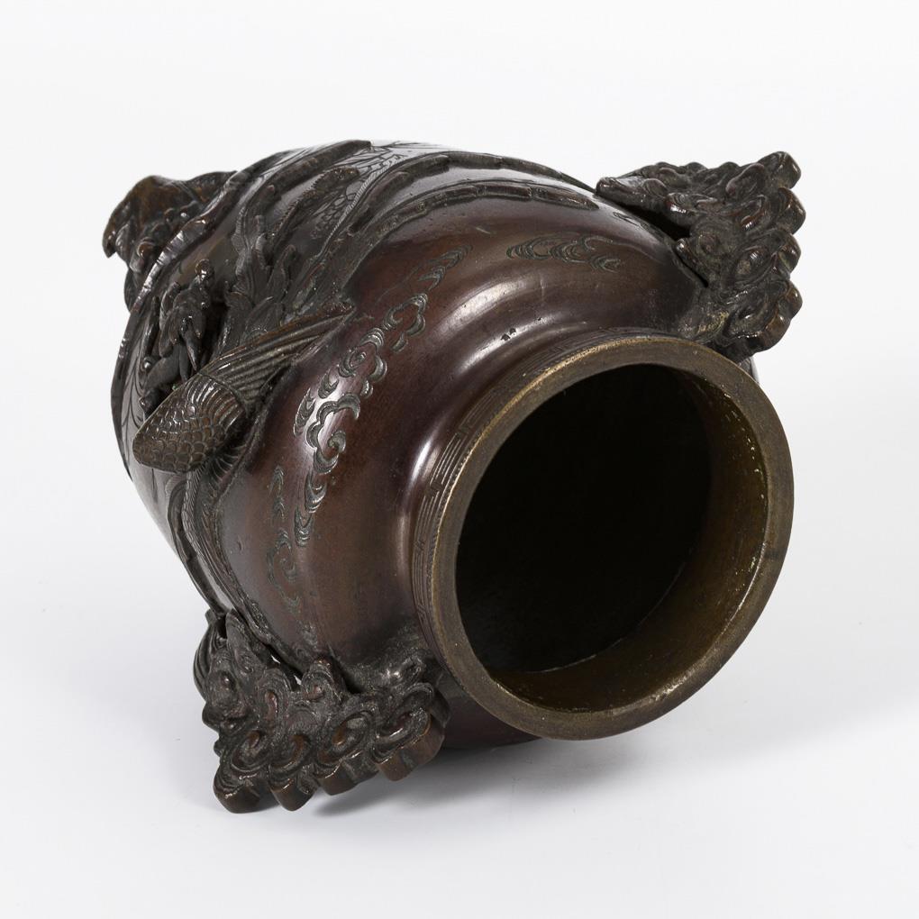 Dreibeiniges Gefäß mit zwei Handhaben als Wolkenformation. In kunstvoller Halbplastik Phönix und Spatz vor zarter Pflanzengravur auf der Wandung. Eine Handhabe mit Lötspur und winziger fehlender Spitze.