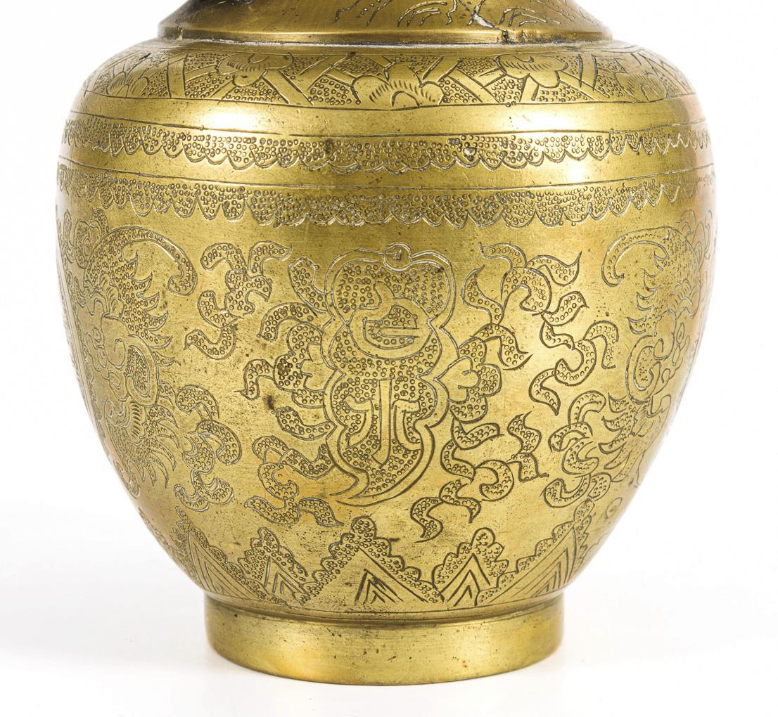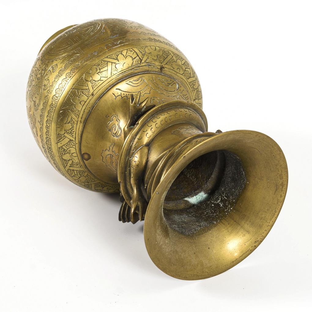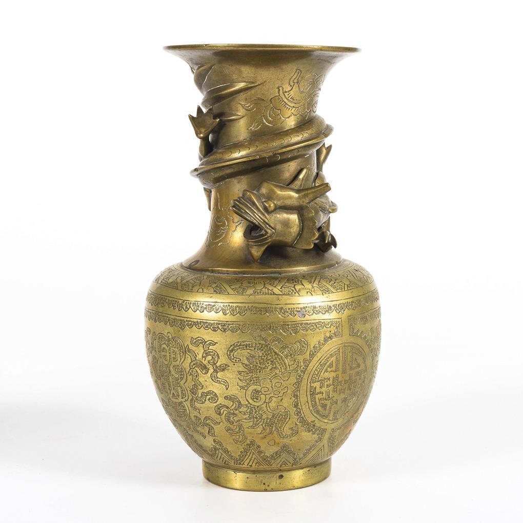 Balusterform mit graviertem Schriftzeichen in ornamentaler Umrahmung. Um den Hals windet sich mehrfach je ein plastischer Drache. Dazu passend gefertigte Holzsockel. Minimale Kerbe im Fußring.