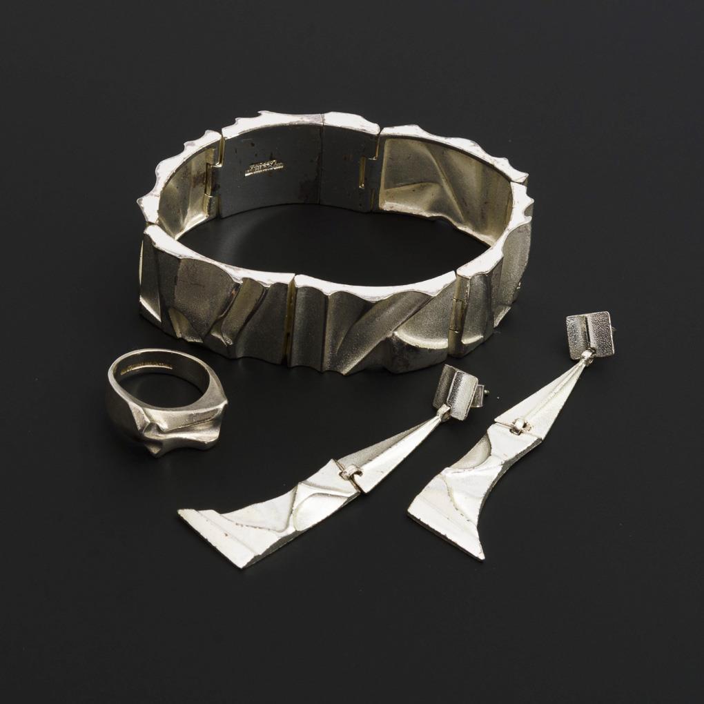 Silber 925 gestempelt: Punzen: Finnland N8 (1990), P8 (1992), Q8 (1993). Armband 18 x 2 cm. Ohrhänger 6,8 x 1,5 cm. Ringgröße 54. 62,5/11,2/7,2 g.