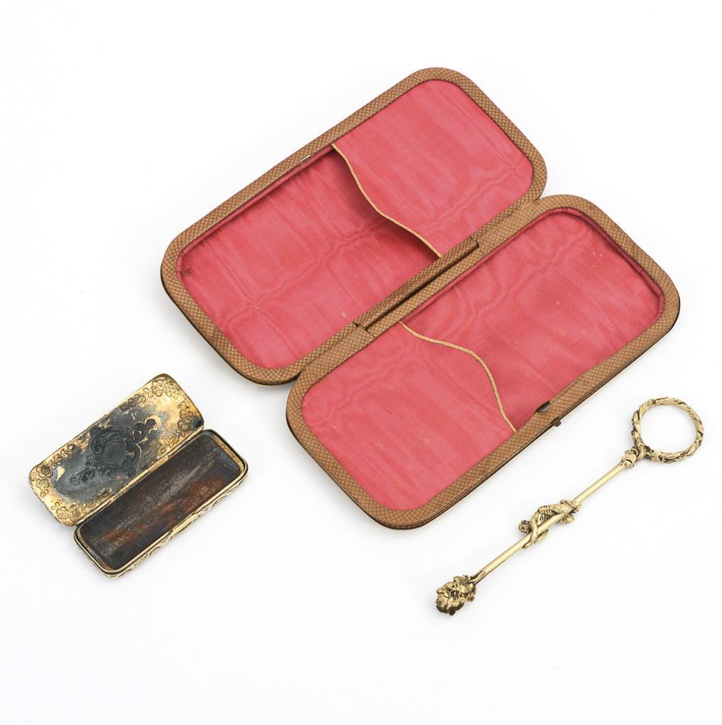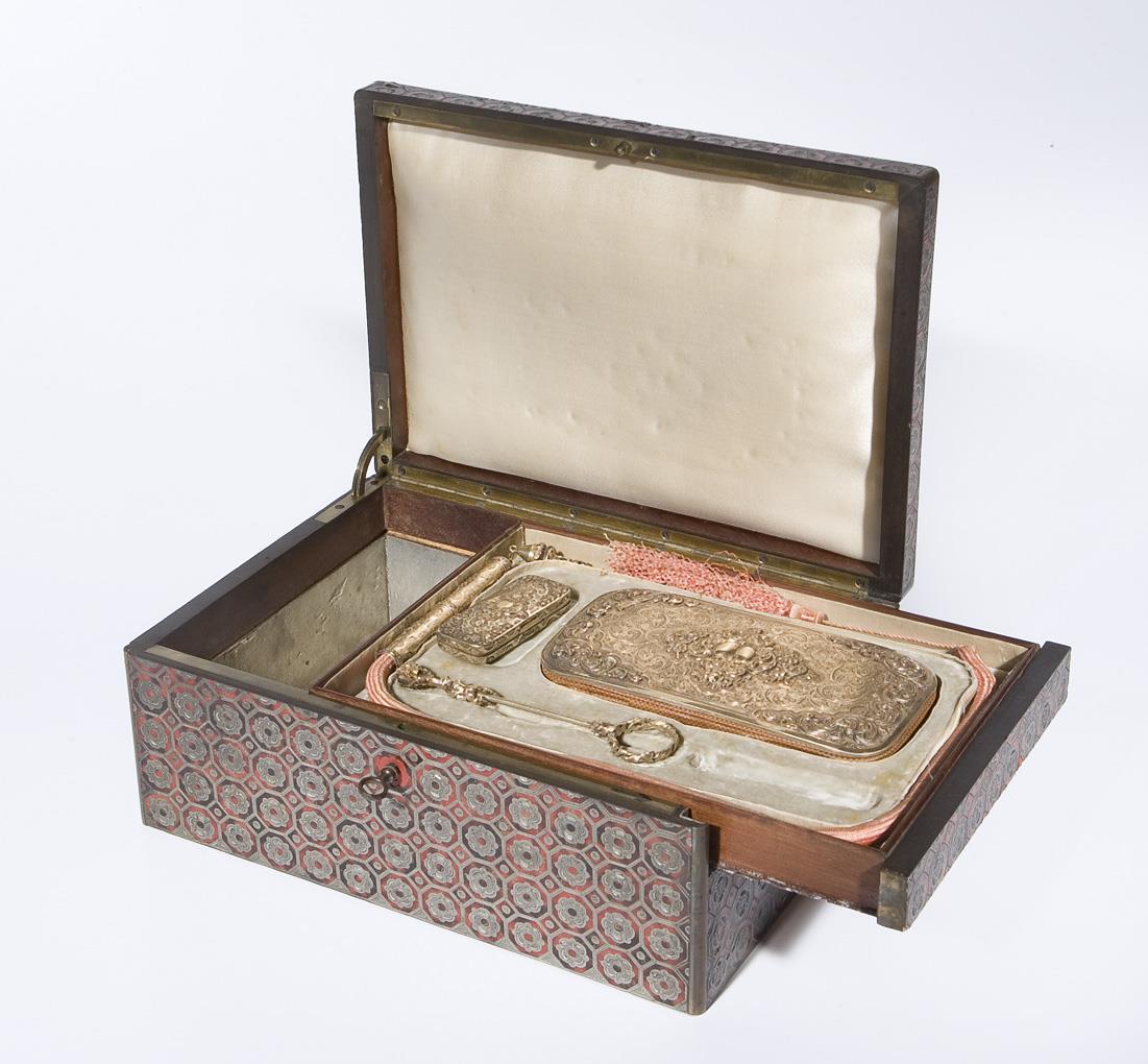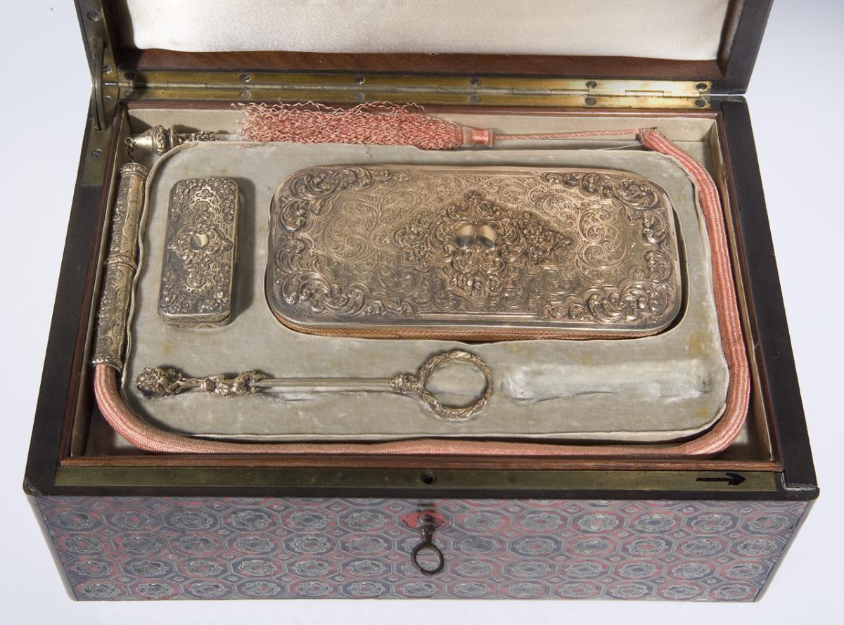 Holzkorpus mit Scharnierdeckel und seitlichem Schub. Darunter zwei verzinnte Fächer. Ornamentale Marketerie aus Schildpatt und Zinn. 4-teilige Silber-Garnitur mit undeutlichen Miniatur-Punzen: Luntenhalter, Zündholzdose mit Reibefläche, Zange mit Faun als Schieber, ein Etui mit doppelseitger Inneneinrichtung. Silber, allseits fein graviert, reliefiert, teils plastisch gearbeitet. Marketerie partiell leicht defekt, Mundstück fehlt.