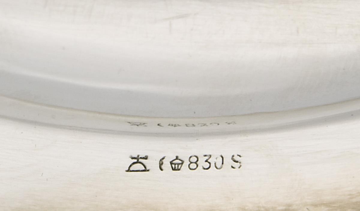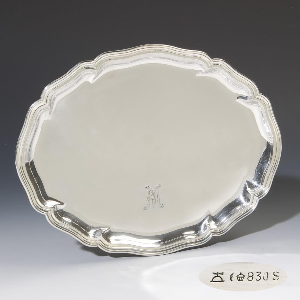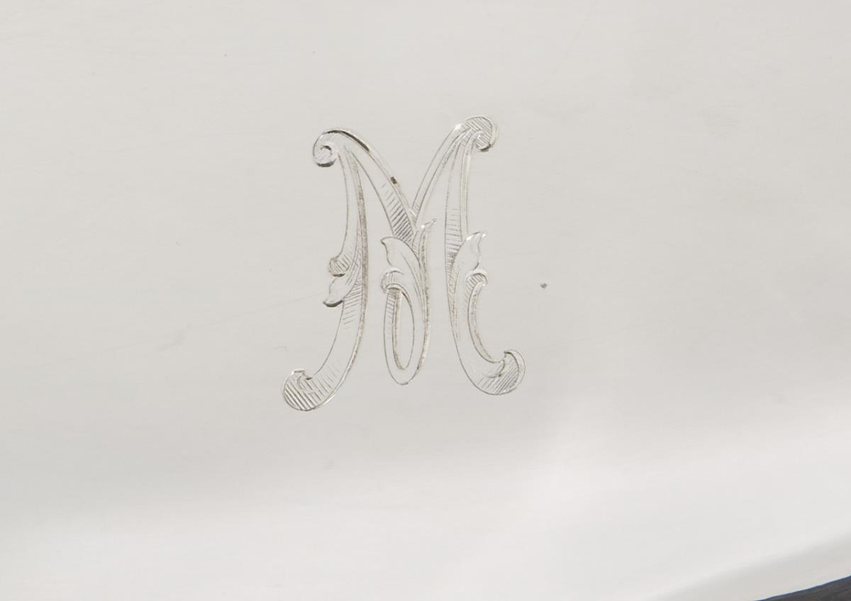 Passig geschweifte ovale Form mit vollem Profilrand. Graviertes Monogramm M. Punzen: Modell-Nr. 2718, Halbmond und Krone, Feingehalt, Fabrikmarke.