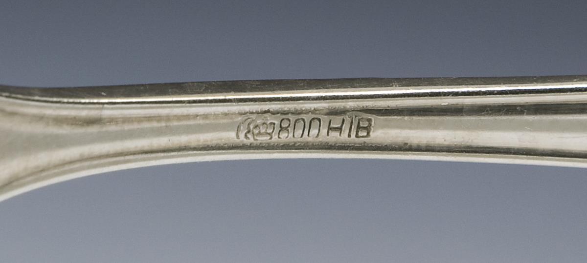 Geschweifte Form, beidseits reliefiert. Punzen: Halbmond und Krone, Feingehalt, Fabrikmarken.