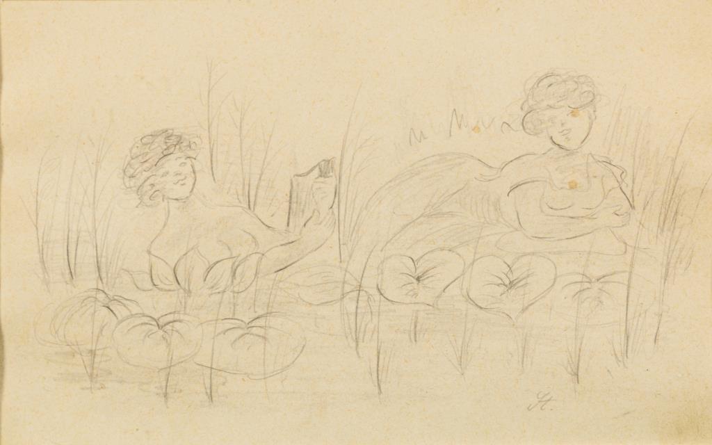2 Zeichnungen mit stilisierten Nixen im Wasser und 1 mit 2 Trunkenbolden im Wirtshaus.