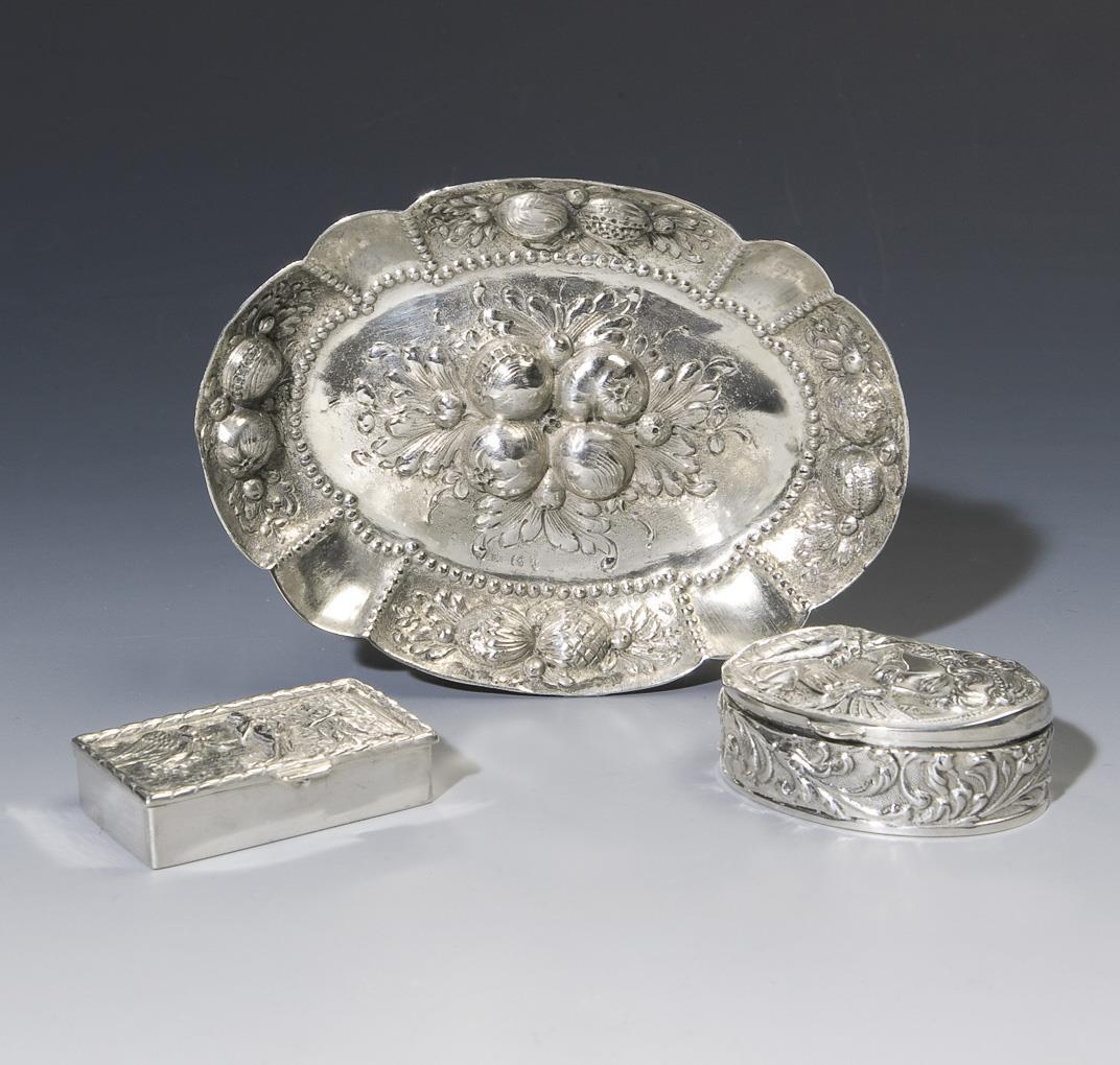 Floral und figural reliefiert. Dosen innen vergoldet, mit Scharnierdeckel und Daumengriff. Punzen: Feingehalt, zwei Fabrikmarken, einmal Halbmond und Krone.