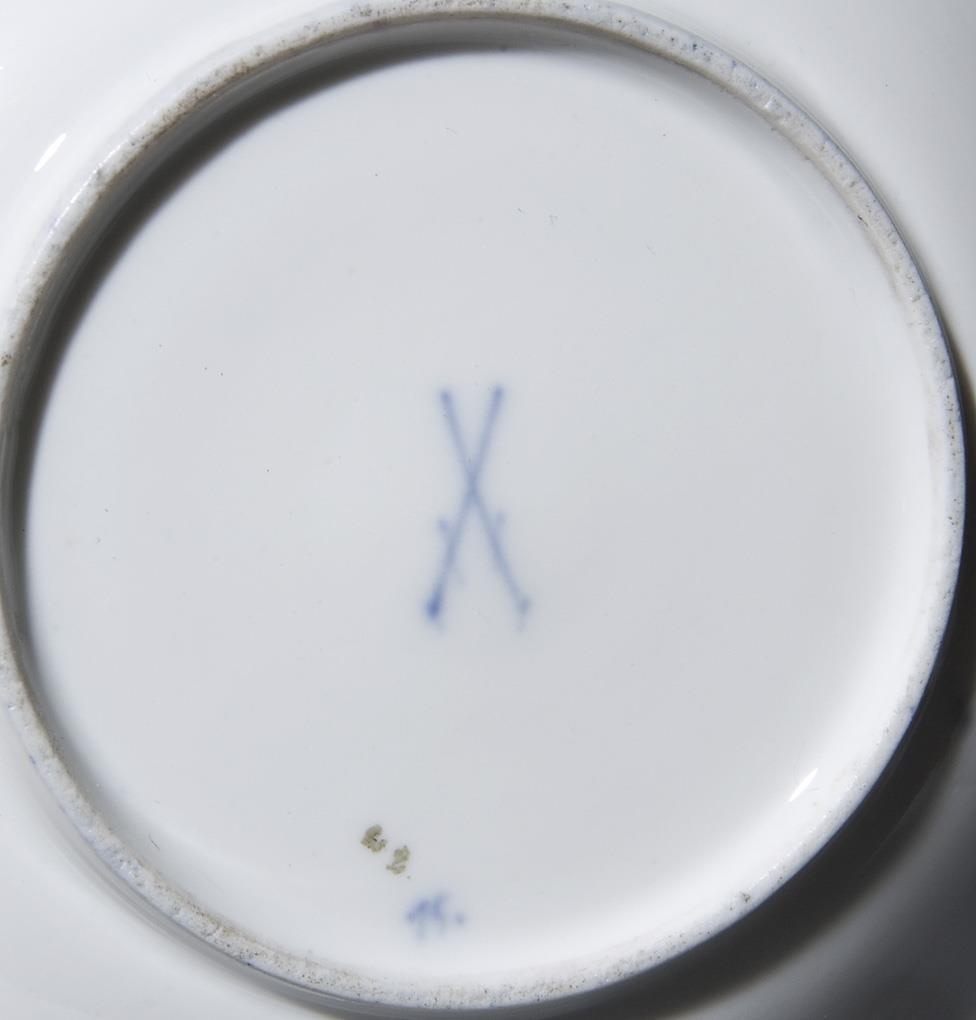 Kobaltblauer Fond, reliefiert, gold staffiert, mattiert und poliert. Malermarken, Schwertermarken. Gold berieben.