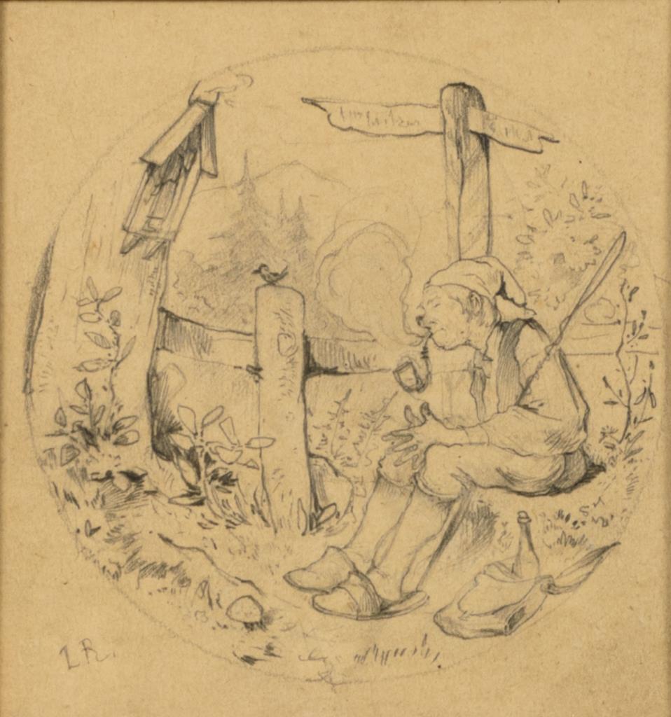 Sehr feine Zeichnung mit Pfeife rauchendem Bauern bei der Rast.