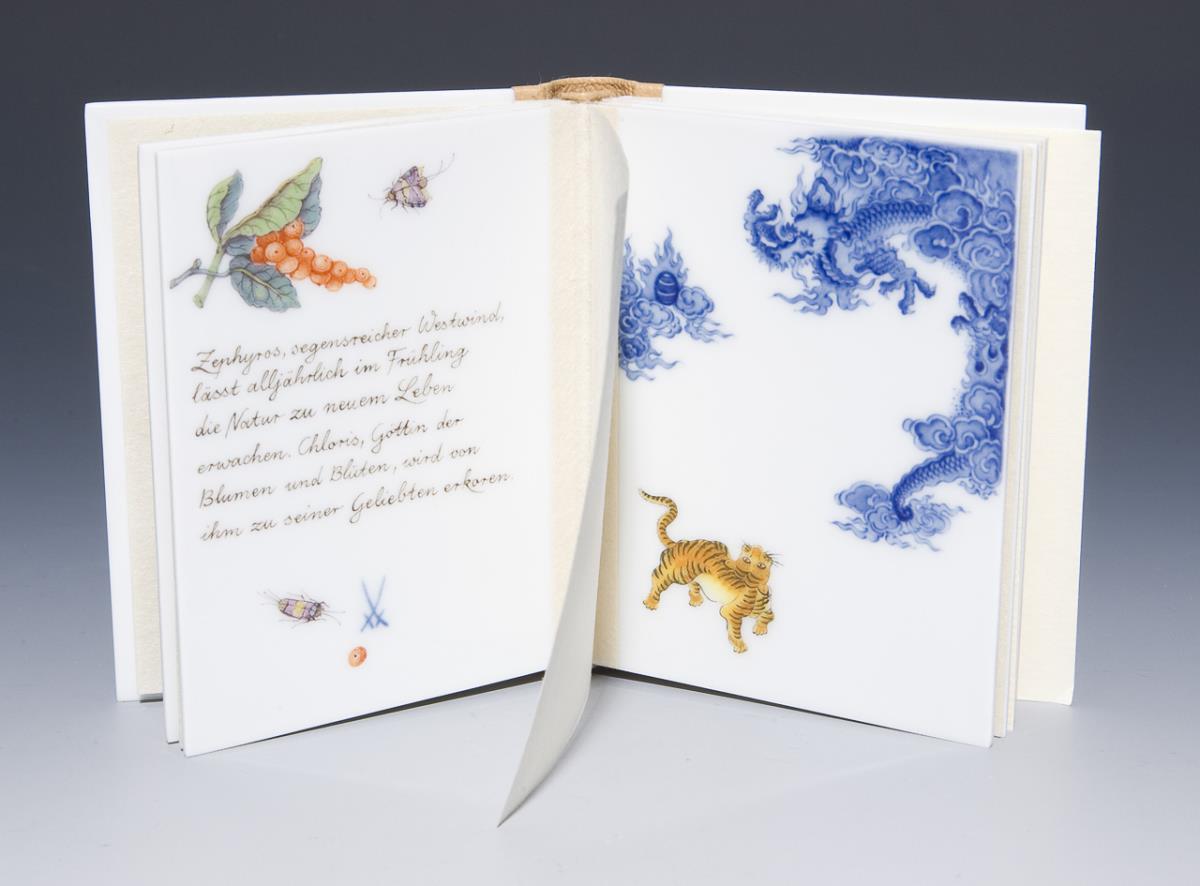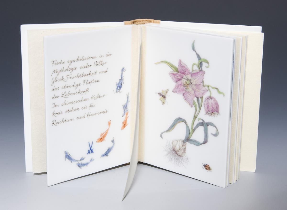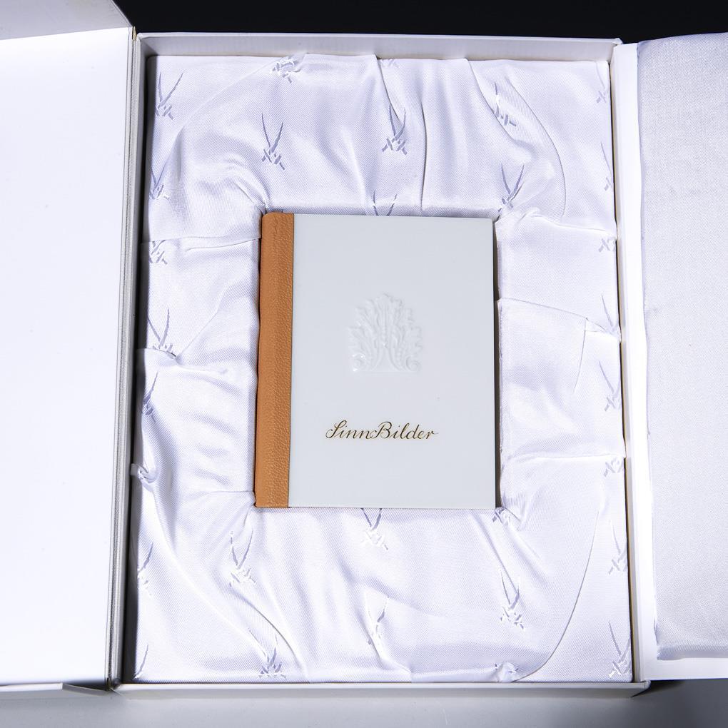 Limitierte Meisterwerke, nummeriertes Exemplar: 3/50. "SinnBilder". Dekor-Nr. 290390. Fünf beidseits bemalte Porzellan-Miniatur-Tafeln mit Texten. Porzellan-Buchdeckel. Reliefierter Titel mit goldenem Schriftzug. Lederrücken. Schwertermarke, goldenes Signet mit Nummerierung.