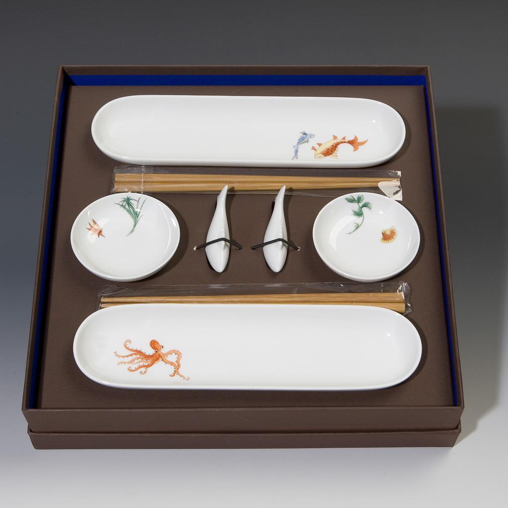 Dekor-Nr. 691401. Farbig bemalt. Dekor "See-Getier". 2 Sushi-Schalen, 2 Soßenschälchen, 2 Stäbchenauflagen, 4 Holzstäbchen. Pressmarken, Schwertermarken.