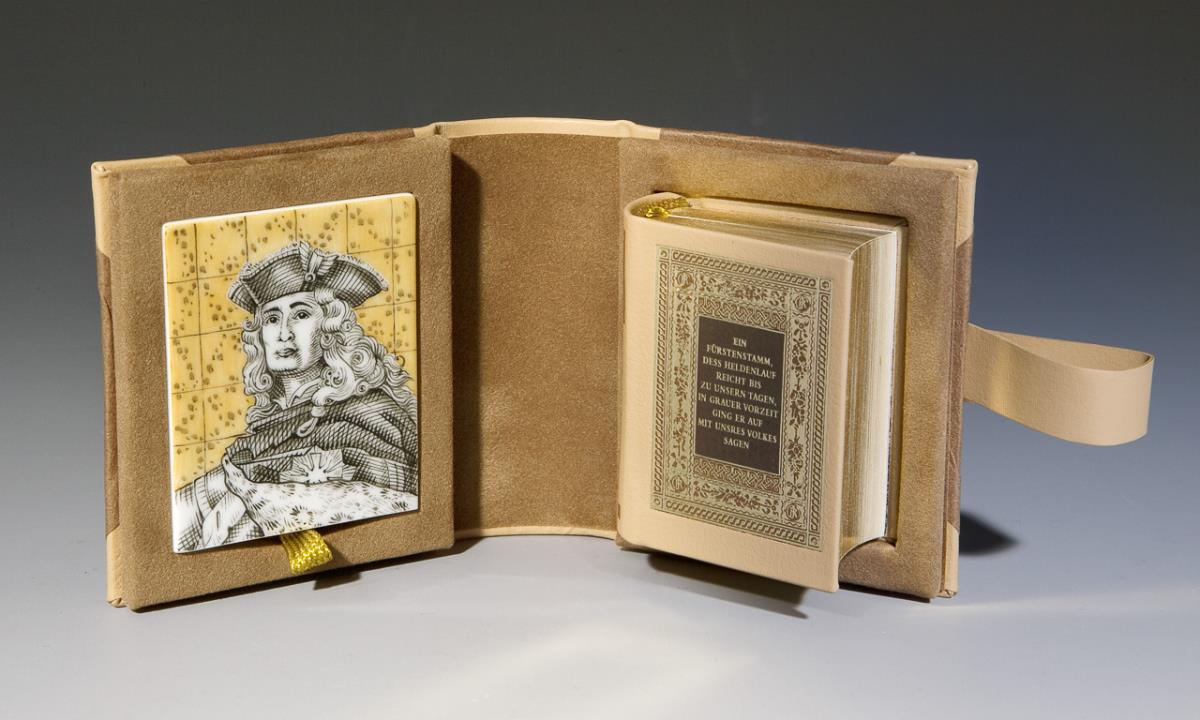 Nummeriertes Exemplar: 19/300. Herausnehmbare gemalte Porzellan-Miniatur "August der Starke" (1670 Dresden - 1733 Warschau, als August II. ab 1697 König von Polen, als Friedrich August I. seit 1694 Kurfürst von Sachsen). Rückseitig goldene Schriftzüge, Schwertermarke. Miniatur-Porzellan-Buch mit Goldprägung und Goldschnitt. Abgebildet sind 35 Herrscher aus dem Hause Wettin zu Pferde. 320 Seiten, Cabra-Schuber.