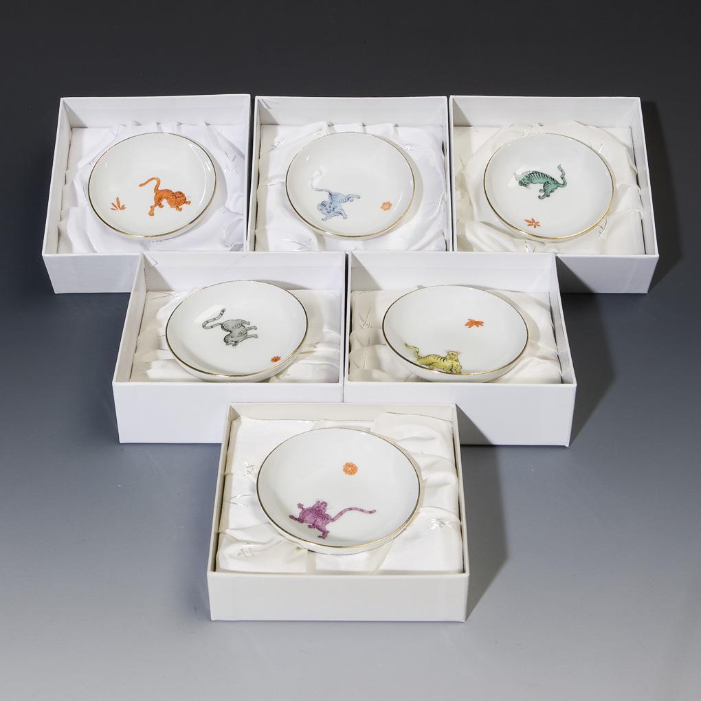 Dekor-Nr. 71a013-71a018. Farbig bemalt, gold staffiert, "Tiger-Dekor". Malermarken, Schwertermarken, goldene Schriftzüge Freunde des Meissener Porzellans.